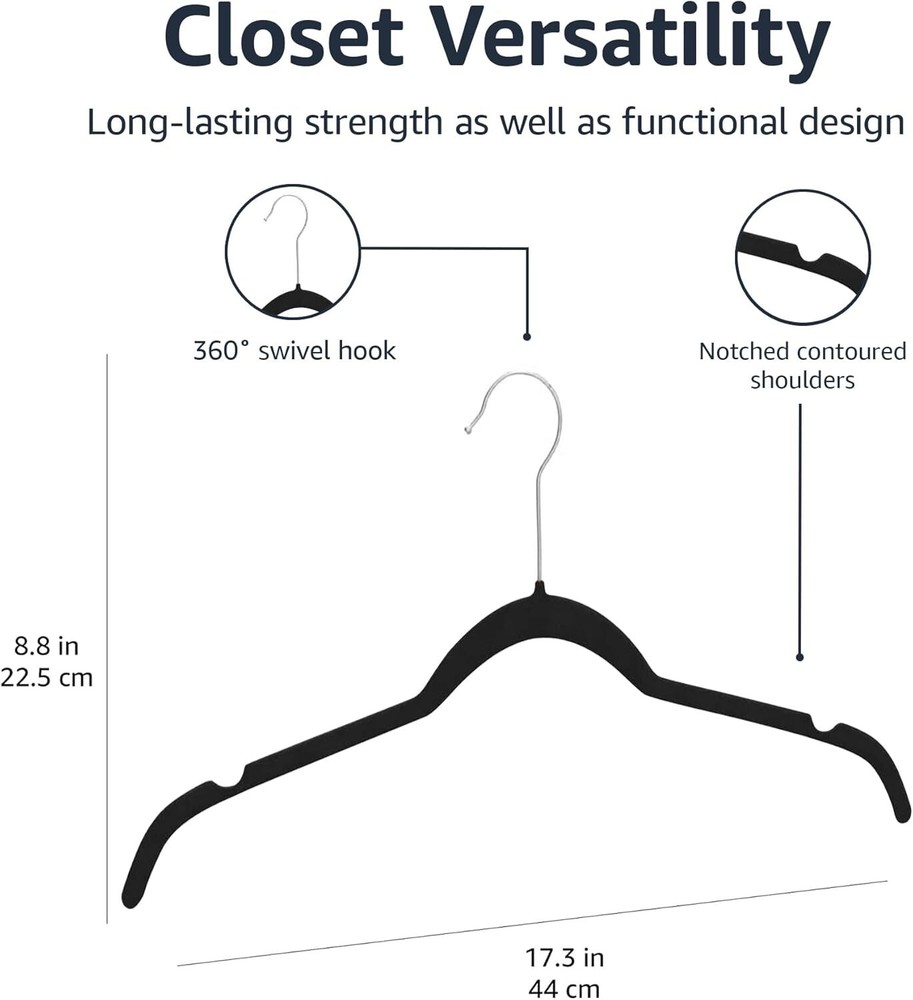 Product Details Color: Black Material: Plastic Product Dimensions: 16.3"W x 9.02"H Special Feature: Slim Recommended Uses For Product: Coat Number of Pieces: 30 Number of Items: 1 Shape: Round Finish Type: Velvet Coated Size: Pack of 30 Maximum Weight Recommendation: 4.5 Kilograms UPC32 Item Weight: 1.55 ounces Country of Origin: China Item model number: AQ-W0002 INCLUDES: 30 clothes hangers in Black/Silver for keeping shirts, jackets, dresses, and more neatly hung and organized CLOSET FRIENDLY: Slim profile helps maximize closet space NON-SLIP DESIGN: Velvet surface and notched shoulders prevent items from shifting and slipping DURABLE: Each sturdy hanger can hold up to 10 pounds PRODUCT DIMENSIONS: 16.4 x 0.2 x 8.9 inches (LxWxH) This product contains 84% Global Recycled Standard (GRS) certified recycled polyethylene terephthalate Product Description Seller Basics Velvet Clothing Hangers - 30-Pack, Black From the Manufacturer Seller Basics