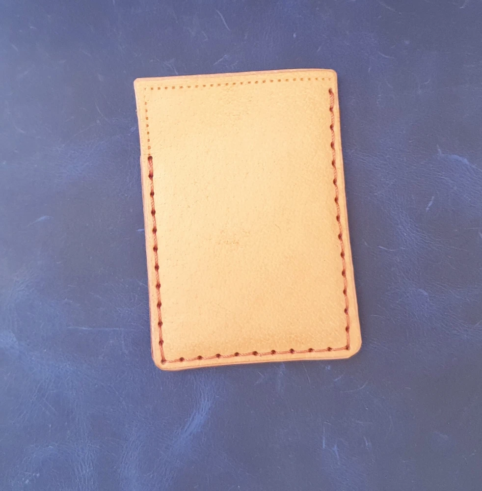 Classic handmade leather card holder. High quality vegetable tanned leather with a thickness of 1.5 - 2 millimeters thick (4 - 5 oz). Two slots for bank cards and folded cash. It is possible to personalize the product. Add your name or text. Engrave your company logo or other image. Please discuss in advance if a specific text or picture is available. Size: 93mm × 66mm / 3.7 in × 2.6 in Weight: 20g./ 0.705 oz. Color - natural, beige. Each product in the photo is a product completely created in the Craft KRK Krakow workshop in Poland. Similar models available. Other colors. Welcome to my needlework store. Note: The color of the product you see on the screen may differ slightly from the color in person due to various factors: Individual screen settings on your phone or computer. The time and place of the product shooting: a photo on the street on a sunny day will differ from a studio photo or a photo from the workshop, a photo on your phone differs from a photo on a professional camera. The difference in the leather batch itself - during the manufacture of the leather material itself, the tone of each batch may differ by half a tone up or down, which is due to the production process itself. We receive the finished color from the leather manufacturer. In case of significant differences in color, we will notify you and coordinate the order.