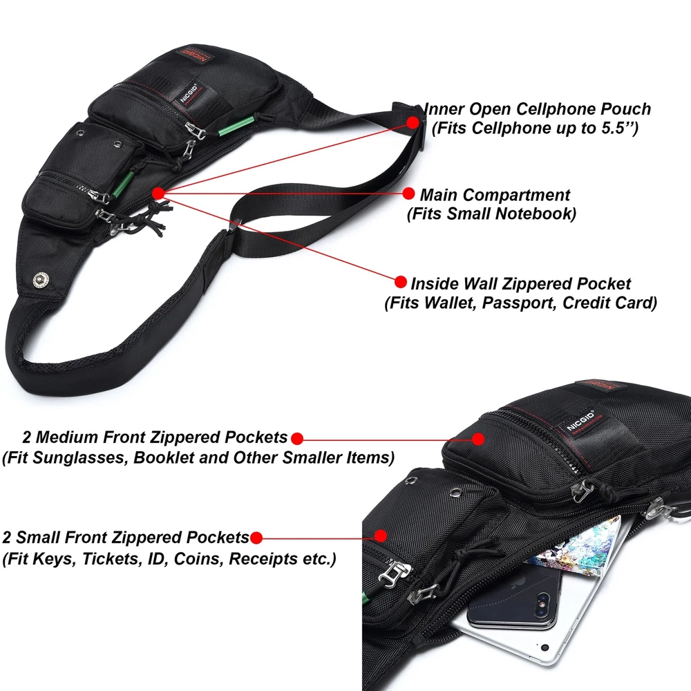 Excellent Nylon Material: Made from tear-resistant and water-resistant nylon fabric. It's the great size and appears to have a very solid construction. Practical: It can carry wallet, pocket knife, lighter, keys, handcuffs, cellphone, and extra-stuff you may need for jogging, camping, family vacation, a day out or a road trip. All at once keeping your hands free so you can enjoy more. Breathable Back & Shoulder Strap: You can adjust it easily for your ideal length and effectively reduces your shoulder pressure and makes you comfortable. Simple, Efficient and easy to work with: You can used as a chest bag and shoulder bag, fit very well for adult men or women. Just right for keeping your essential belongings close and safe. Customer Service: If for any reason our sling bag doesn't meet your expectations, all you have to do is let us know. We will provide you satisfying solution. (Through the order ,clicking : CONTACT SELLER)