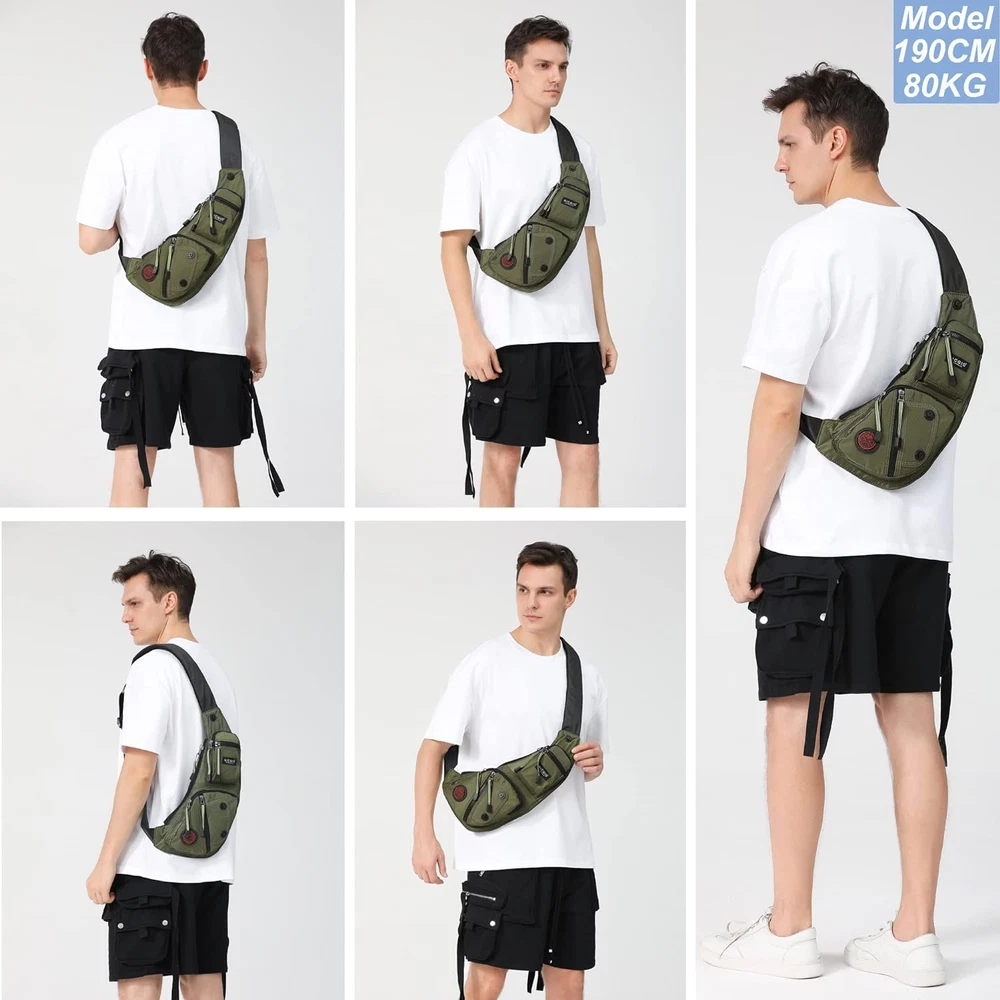 Material: This sling bag is well constructed of water-resistant nylon material. Lightweight, strong and sturdy. Not easy to be scratched. The size of it is bigger than a fanny pack, but not as big as a backpack. Unbalance Backpack Wearing Styles: It has great flexibility. You can use it both as chest pack and shoulder bag. Also it can be worn in the front or back of body. Multiple Storage Purpose Sling Bag: Large main compartment with inner open cellphone pouch is perfect for 8.3'' Tablet with cover, Small notebooks, Large cellphone. 4 front zippered pockets are great for various of small items. Sturdy: Good construction and strong and sturdy bag. Shoulder strap is adjustable to meet different requirements for both men and women. Also for plus size people. Versatile: It's for walking/traveling/biking/hiking/museums/theme parks and everyday using. Also it's a great gift for adult. Product Description Keep your hand free while you are walking, hiking or traveling. ✔ Gifts for women and men. ✔ Sturdy, hands-free, safe, comfortable. ✔ Multiple compartments capable of holding your phone, cash, cards plus a few other essentials, make all your valuables safe and well organized. Smart & Unique Design ✔ 1*main compartment with inside open pocket & zippered pocket ✔ 2*front pockets ✔ 1*front pocket on the top ✔ 1*back hidden pocket ✔ 1*adjustable padded shoulder strap STURDY AND WATER RESISTANT MATERIALS This sling chest bag is made of nylon. Top-quality zippers and durable shoulder strap. UNBELIEVABLE ORGANIZED 4 Zippered Compartments with one hidden anti-theft pocket in the bag to secure all your items. HIDDEN ANTI-THEFT POCKET Hidden anti-theft pocket is safe for protecting your valuable items inside when you are travelling or lining up. ADJUSTABLE SHOULDER STRAP The Shoulder Strap is easily adjustable with padded. It feels comfortable whether worn on the front, back, or cross body.
