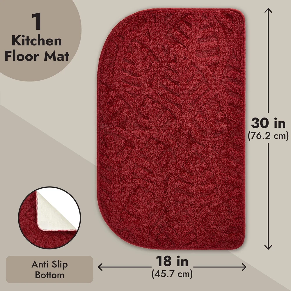 These slip-resistant kitchen rugs for your floor are crafted from comfortable and easy-to-clean polypropylene. Give your feet the ultimate gift of long-lasting comfort while simultaneously elevating your kitchen decor. The half-round anti fatigue mat measures 30 x 18 inches, perfectly sized to fit in front of the sink, stove, or entryway. Please note: the slip-resistant backing is recommended for dry floors only; it will not properly grip on wet floors. Red Rugs for Kitchen: This red kitchen mat is the perfect combination of style and function; the half-round shape effortlessly adds sophistication to your kitchen decor Personalize Your Home: Place the half round door mat at the stove, sink, or fridge to provide your feet with comfort while simultaneously complementing your existing red kitchen and home decor Standard Size: The half round rug measures 30x18 inches and is a versatile addition to any room in your home, from the kitchen or bathroom to the entryway or living room Easy To Clean: Crafted from high-quality polypropylene and featuring non-skid backing, our red kitchen rug is a durable and easy-to-maintain, simply vacuum the mat to keep it looking clean and fresh Versatile Rug: You will receive 1 red half moon rug for the kitchen or bathroom; please note: this rug is recommended for dry floors only; the grip backing will not properly function on wet flooring