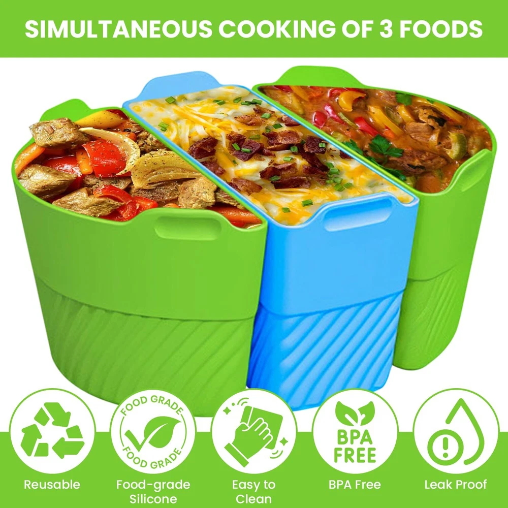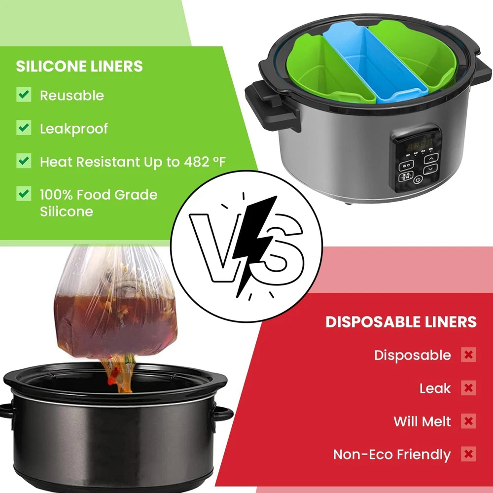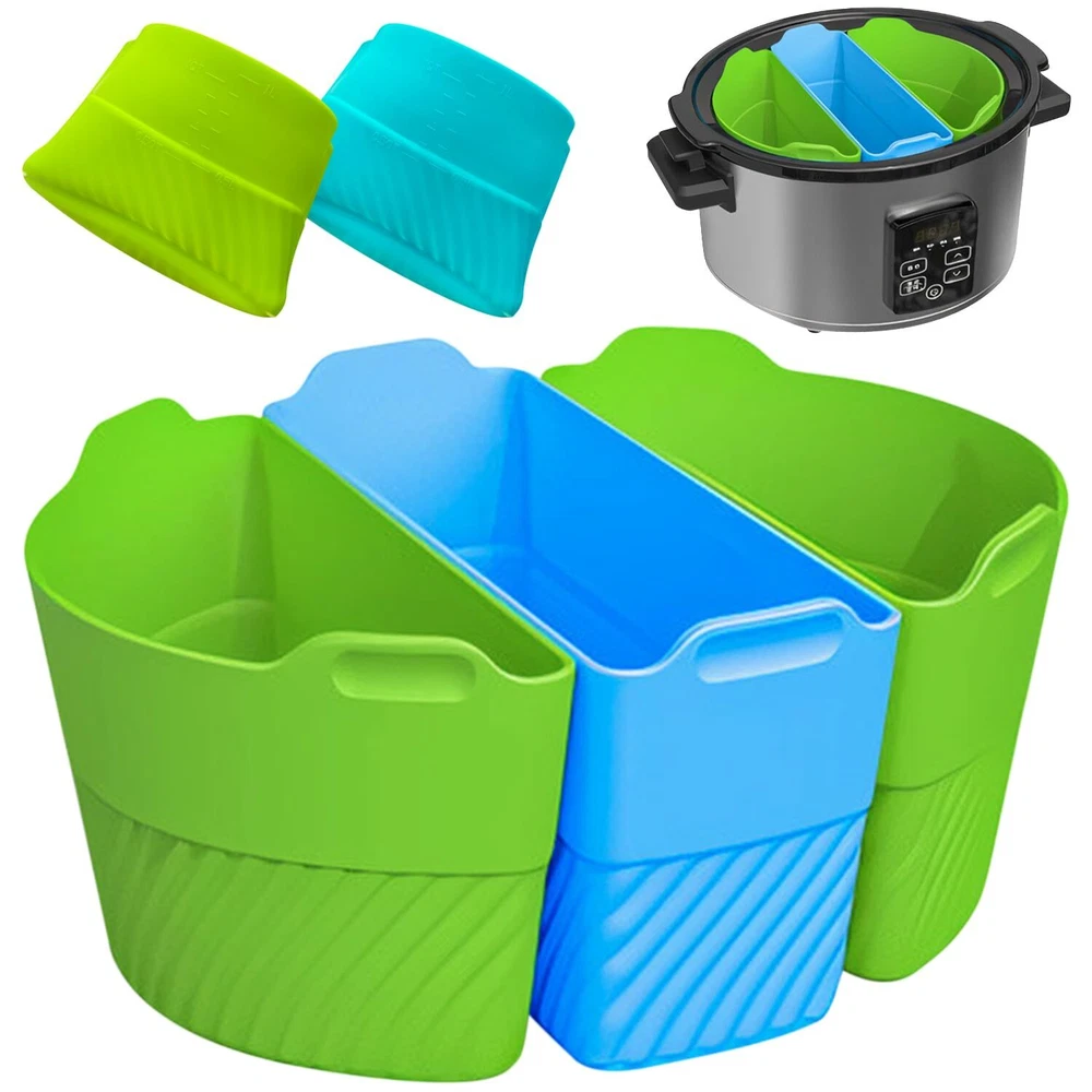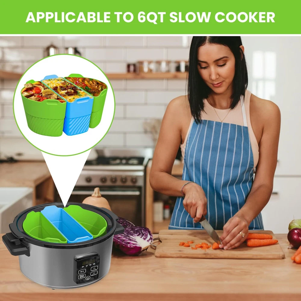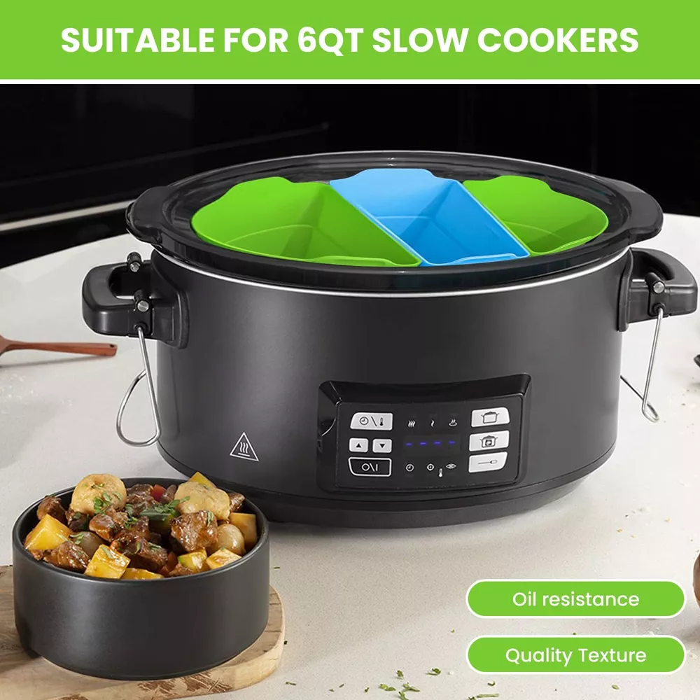 Our company focuses on developing new and exciting products that make your day-to-day life easier. For that, we rely on verified suppliers and a team of talented product developers that allow us to make sure our products exceed your expectations and make your life easier. Our silicone slow cooker liners are an excellent option for what our team can achieve. With a simple and practical design, this set of 3 slow cooker inserts is a must-have for faster, easier, and healthier meals. Slow Cooker Three-in-One Silicone Inserts The slow cooker silicone divider insert set allows you to cook up to 3 types of food at the same time, cutting down on the cooking time and energy consumption. The silicone slow cooker liner reusable & leakproof silicone ensures safety and convenience while cooking. The slow cooker insert kit is dishwasher safe and has a non-stick texture. The slow cooker silicone insert is reusable, which makes it an excellent option for a sustainable kitchen. Some features to keep in mind about our 3-dish slow cooker silicone insert kit: 1. The set includes 3 silicone inserts in green and blue 2. Practical built-in handles for easier transport 3. Made of 100% silicone 4. BPA-free materials 5. Heat resistant at up to 482 degrees F 6. Dishwasher safe and easy to clean 7. Easy storage 8. Non-stick and leakproof design 9. Collapsible style 10. Inner raised measurement guide 11. Reusable and sustainable 12. Durable and long-lasting Simplify your life with our excellent slow cooker dividers silicone! Cooking Can Be Fun and Easy: The 6-quart slow cooker divider set is the secret to effortless cooking and almost no cleanup. These non-BPA liners ensure withstand temperatures of up to 482-degrees F for more safety and convenience. Time-Saving Accessories: By dividing the pot into up to 3 parts, you can cook several foods simultaneously and turn your slow cooker into an even more versatile tool. The small slow cooker liners prevent flavor mixing for efficient meal prepping. Easy and Effortless Cleanup: Our silicone liner set features a non-stick and leakproof design that is very easy to clean by hand or in the dishwasher. This allows you to save time and spend precious moments with your loved ones. More Convenience and Versatility: The slow cooker liners 6-quart feature tab handles for easier transport and serving straight from the slow cooker, which means no spills or mess. The liners have raised measurement guides on the inside for more convenience. Sustainable Living: These slow cooker liners small are a planet-friendly choice for a sustainable lifestyle. The liners are washable and reusable so you can avoid the use of disposable accessories. Additionally, they are collapsible for easy storage even in smaller kitchens.