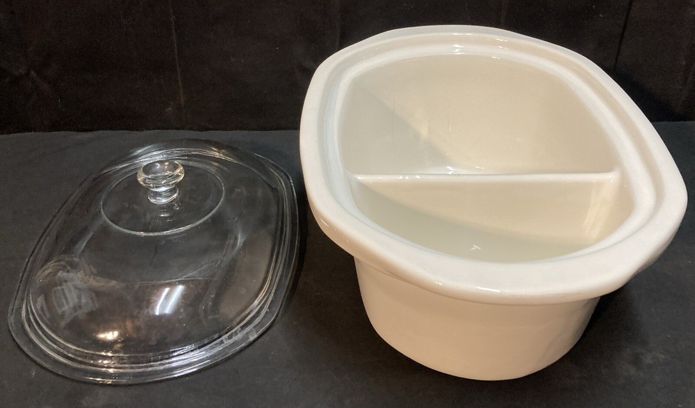 This Slow Cooker Replacement Divided Sections White Ceramic Insert for Crockpot w/Lid. The item comes in good, clean condition with no chips, cracks, or breaks. The larger half holds 2.5 quarts and the smaller half holds 1 quart. Please note that the there are some cosmetic imperfections on the sides. Please see pictures for details. If you any questions or concerns, please not hesitate to contact us. Check out our other items and message us if interested in more than one listing as combining items could save you money on shipping.