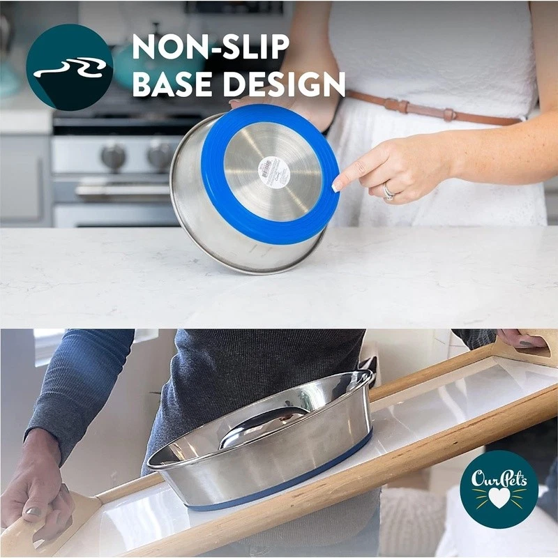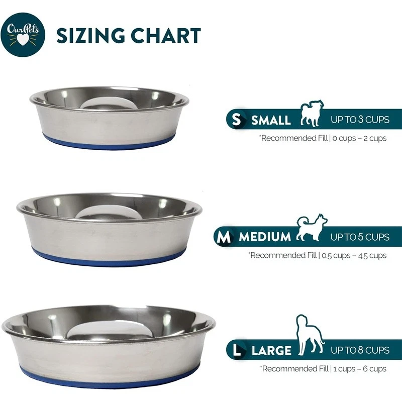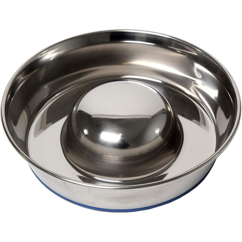 Elevate your dog's mealtime with the Our Pets DuraBowl Slow Feed Stainless Steel Dog Food Bowl. Engineered for safety, the solid centerpiece design encourages slower, mindful eating, reducing choking hazards and aiding digestion. The patented skid-proof bottom ensures stability, preventing sliding and tipping. Crafted from durable stainless steel, this bowl offers a healthier alternative to plastic, challenging your pet's mind during meals. Dishwasher-safe for effortless cleaning, it remains rust-resistant and minimizes odors. Available in three sizes (Small, Medium, Large), accommodating various breeds. Prioritize your dog's well-being and mealtime happiness with the DuraBowl's innovation and durability. Slow Feeder Dog Bowl Benefits: A slow feeder dog bowl can help reduce choking. When eating from this slow feeder dog bowl, the solid centerpiece design causes them to eat along the edge with more mental attention, resulting in a slower feeding routine. Patented Skid-Proof Bottom: The DuraPet slow feeder dog bowl is a top-of-the-line design at an affordable price. To prevent skidding, a permanently bonded ring was added to the bottom. This design prevents sliding and tipping during feeding time. Slow Feeder Made of Heavyweight, Durable Stainless Steel: Durable, long-lasting stainless steel dog bowls offer a healthy alternative to plastic. A great alternative to snuffle mats for dogs, lick mats for dogs, and dog puzzle toys. Dishwasher Safe Dog Bowls: Dishwasher-safe for easy cleaning. Our dog slow feeder bowl dog dishes are rust resistant, hygienic, and don’t hold odors. Available in Three Sizes: Small: holds up to 3 cups of dry food, Medium: holds up to 5 cups of dry food, Large: holds up to 8 cups of dry food.