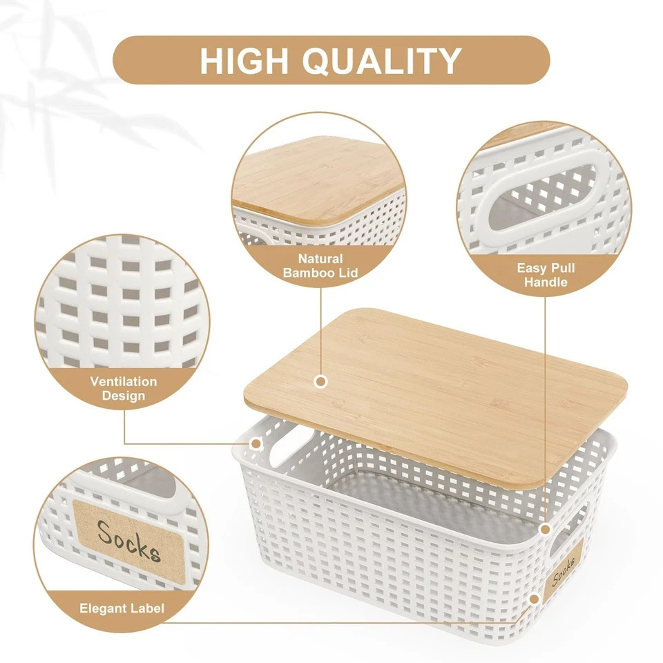 100% Money Back Guarantee if you are not satisfied with your purchase! ___________________ Description: Our 6 pack small storage bins with lids is the perfect solution for clutter. Featuring natural bamboo lids and a compact 【10"L x 7.1"W x 4.1"H】 size, each storage container offers a 5-quart capacity. BPA-free and non-toxic, our cute storage organizers are perfect for use as storage baskets on shelves, in cabinets, in classrooms, under sink, and other tight spaces. Ideal for organizing pantry items, office and art supplies, cosmetics and medications, or craft material. 【Multi-Purpose Organization and Storage Solution】Achieve complete organization and storage for your entire home. These versatile storage bins with lids are perfect for every small space: use these storage bins for snacks in the kitchen, storage bins for toiletries in the bathroom, storage bins for accessories in the closet. The secure lids keep everything dust-free and looking neat. 【Stackable Storage Basket with Lid for Saving Space】This mini storage basket with lid is designed for efficiency. The stackable design allows you to maximize vertical space on your shelves. When not in use, the bins nest together for compact storage. Side handles make it easy to carry this plastic storage basket with lids from room to room. 【Vented & Labeled for Easy Categorization】Our storage bins with lids feature a vented design to keep contents fresh and prevent odors. These storage bins includes 15 adhesive labels for effortless categorization. Made from easy-clean plastic, maintaining your new organized system is simple. 【The Perfect Gift for an Organized Home】Ready to gift! This stylish and functional set of plastic lidded storage bins comes beautifully wrapped. It's the ideal present for anyone who loves a clutter-free home, making it a hit for holidays, housewarmings, and birthdays. ________________________ 100% Money Back Guarantee: We offer 30 Day Money Back Guarantee from the day you purchased if you’re not satisfied with your product. If you have any questions about our products, please contact us as soon as possible. Customer satisfaction is our absolute priority. Shipping: We are always working hard to ensure your package arrives as soon as possible. Please understand that some factors like weather, high postal traffic, and the performance of shipping companies are outside of our control. We offer free shipping to the lower 48 states and ship within 3 business days of payment, usually sooner. We do not accept P.O. Boxes. Please provide a physical address. You will be notified via eBay messages as soon as your items ship. Delivery: We will ship out the item in 2-3 working day after receiving the payment. Usually the delivery takes 2-5 business days. If you don't receive the items after 10 days, please feel free to contact us. You will get a replacement or a full refund. Please DO NOT open a return request or leave negative feedback without asking for help . Returns (Get Free Return Label): We offer a 30-Day Return Policy on defective/wrong items or items which you are not completely satisfied with. You have the option for a full-refund or an exchange of the item. No need to buy eBay return label. Contact us via eBay messages and get free return label. Returned items must be in all of the original packaging and include all of the original accessories or items that came with it. The item and package should be in original condition. Contact Us: Any queries or issues incurred, please feel free to contact us via eBay message, we will get back to you within 24 hours. Please DO NOT open a return request or leave negative feedback without asking for help. Feedback: Your feedback is very important to us. After you get your package and you are satisfied with our service, please leave us positive feedback. We are highly appreciated for your POSITIVE feedback and 5 stars. Enjoy shopping.