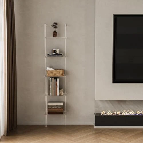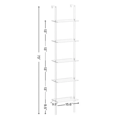 Return Policy Fast Delivery Trusted seller Small Acrylic Ladder Bookshelf, 9.5" D x 15.6" W, 5-Tier Clear Wall Mounted Book Shelf for Small Spaces, Multipurpose Bookcase for Living Room, Bathroom, Office, Modern, 73" H Product Description Premium Acrylic Material: Constructed with premium acrylic, our ladder bookshelf offers a unique blend of sophistication and durability. Never worry about the peeling veneer. Space-Saving: 9.5" D x 15.6" Wx 73" H, compact size ensures it can fit into smaller areas, making it suitable for apartments, offices, or any space with limited room. The open design allows for easy access to your belongings, making organization effortless. Wall Mounted Design: The ladder-style design mounts gracefully against the wall, maximizing vertical space while creating an eye-catching display. It's a perfect solution for those who appreciate a minimalist aesthetic. Modern Aesthetics and Durability: Elevate your interior with the modern aesthetics of our acrylic ladder shelf, seamlessly blends with various decor styles. The transparent nature of acrylic adds a modern and airy feel to any room. Plus, the sturdy construction ensures long-lasting durability, making it a reliable addition to your home or office. Easy to Clean and Install: Enjoy hassle-free maintenance with the easy-to-clean acrylic surface. The straightforward installation process ensures that you can effortlessly set up your bookshelf. Shipping Returns Payment Shipping Shipping is FREE to all addresses other than APO/PO boxes in the lower 48 states. All our stock ships from US-based warehouses. Shipped via USPS or UPS (depending on location and package weight) Unless stated otherwise, all orders will ship within 24-72 hours of your payment being processed. Check our feedback to see the great reviews of FAST shipping we offer. Returns Seller does not accept returns Payment We currently accept payment via eBay managed payments only. Once payment is cleared, we will dispatch your shipment within 1-3 business days. Please refer to the "Shipping" tab for more information regarding shipping speed to your destination.