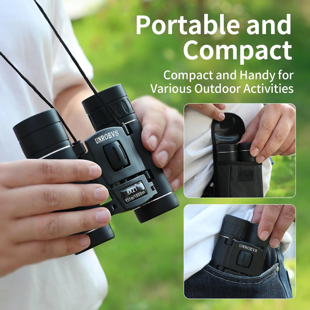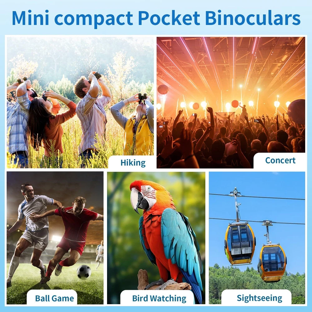 Compact Lightweight Binoculars:You won’t hesitate to take this small,lightweight,foldable binoculars into your backpack when every outdoor activities. Small Binoculars with Clear Vision:Designed with real 8x magnification and a 21mm objective lens. Esily to Focus:Just adjust by Smooth "center-focus knob" and right eye lens. The folding binoculars suitable for both adults and binoculars. Pocket Binoculars with BAK4 prism:Enjoy your great outdoors with a bright and wide image. Pull the Bond of Parent-Relationship:Bring cute and this pocket binoculars to explore the wonderful world.