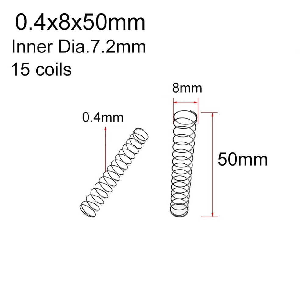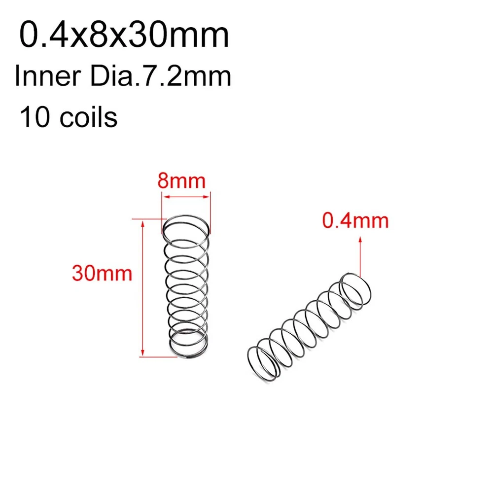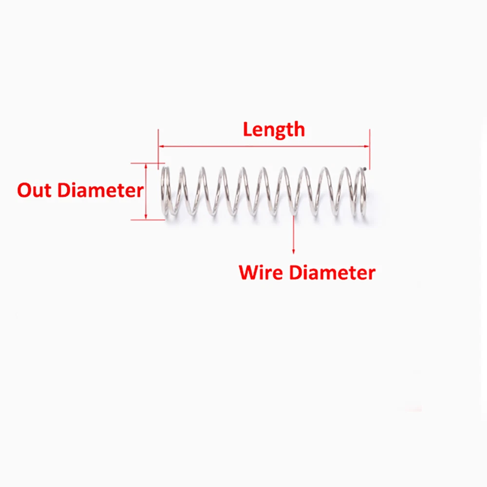 Description Material: 65Mn Spring Steel Size: Wire diameter*Out Diameter*Length Internal Diameter =Out Diameter - 2 * Wire Diameter ( For example ,Size 0.5*9*40mm,means the wire diameter is 0.5mm,the out diameter is 9mm,the length is 40mm, the inner diameter is 8mm.) Package including: According to your choice.