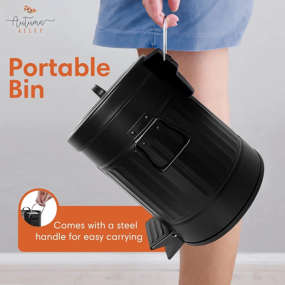Small Farmhouse Rustic Bathroom Trash Can Wastebasket 1.3 Gallon - Matte Black Condition: New Item - Includes original packaging but there may be light damage to packaging - Guaranteed to function perfectly and include all parts Description: About this item Durable, Well-design, and Functional Black Bathroom Garbage Can with Lid- Autumn Alley's farmhouse black trash can with lid and pedal is long-lasting and well-designed with strong metal construction, easy to clean, and keeps trash out of sight and mind. Autumn Alley bathroom trash adds a modern retro flair. Farmhouse Trash Can with Removable Bucket Liner - Taking out the garbage is clean and simple with this galvanized trash can with its removable inner bucket with a carrying handle. Ideal for farmhouse rustic bathroom accessories décor Push Foot Pedal - This black bathroom trash can has a hands-free mechanism that allows you to throw trash away without having to hold the lid open. Perfect retro wastebasket for your vintage bathroom. Farmhouse Bathroom Trash Can Décor - Our rustic trash can is easy to use and maintain, and it adds farmhouse rustic décor to areas like the bathroom, living room, office, and garden. State-of-the-art powder coating prevents rust in wet areas. Farmhouse Bathroom Accessories Set Collection - Consisting of a wide range of modern rustic home décor pieces, Autumn Alley aims to provide practical home-bathroom décor and kitchen décor solutions that are beautiful, affordable, and functional. Visit our online store from our large selection to complete the rustic farmhouse bathroom decor-inspired home of your dreams. Powered by SixBit's eCommerce Solution Powered by SixBit's eCommerce Solution