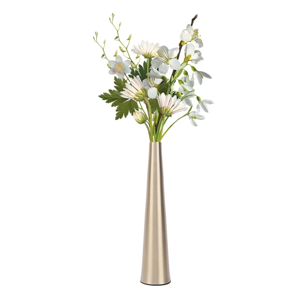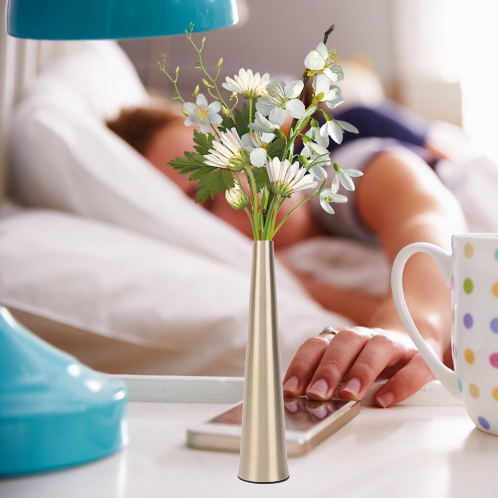 Feature: 1. Rugged And Textured Design: Crafted from excellent aluminum material, this decorative floral vase features a brushed finish, adding texture and elegance. It is built to last, ensuring that it remains a centerpiece for years to come. 2. Secure And Furniture Friendly Base: Equipped with a non slip sticker at the base, this small narrow neck vase effectively prevents accidental falls and guards your furniture from scratches, making it a practical and safe choice for any space. 3. Versatile Decor: Suitable for farmhouse or office decor, fireplace displays, and home decoration for living room and kitchen countertops. It is suitable for weddings, birthdays, events, and can be given as a gift to Xmas, anniversaries, or housewarmings. 4. Multifunctional: Showcase your individual style with this minimalist small flower vase by filling it with various plants, freshing flowers, artificial florals, or greenery, creating a refined and rustic, yet elegant and aesthetically pleasing environment in your home. 5. Compact And Elegant Cylinder Design: This small cylindrical container is suitable for both home and office decor. Its golden finish beautifully complements a variety of plants, while the tapered metal vase design includes a non slip pad to prevent slipping and guard the finish it rests on. Specification: Item Type: Small Flower Vase Material: Aluminum Size: Mouth Diameter: Approx. 2.2cm / 0.9in Base Diameter: Approx. 5cm / 2in Package List: 1 x Vase