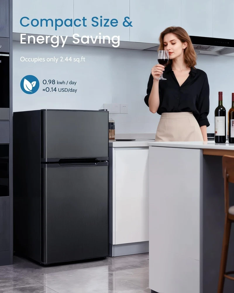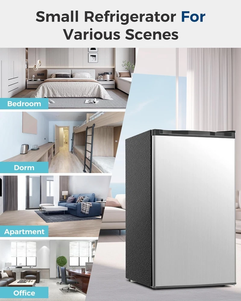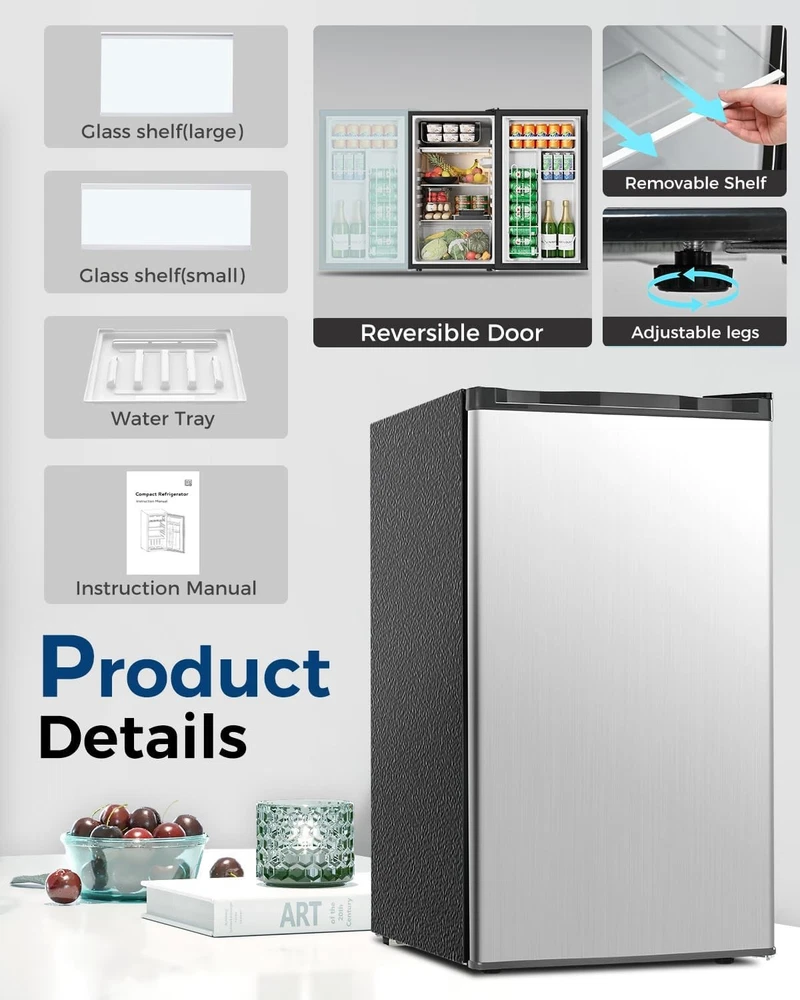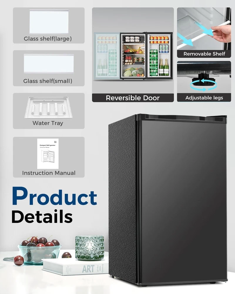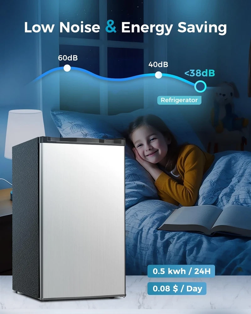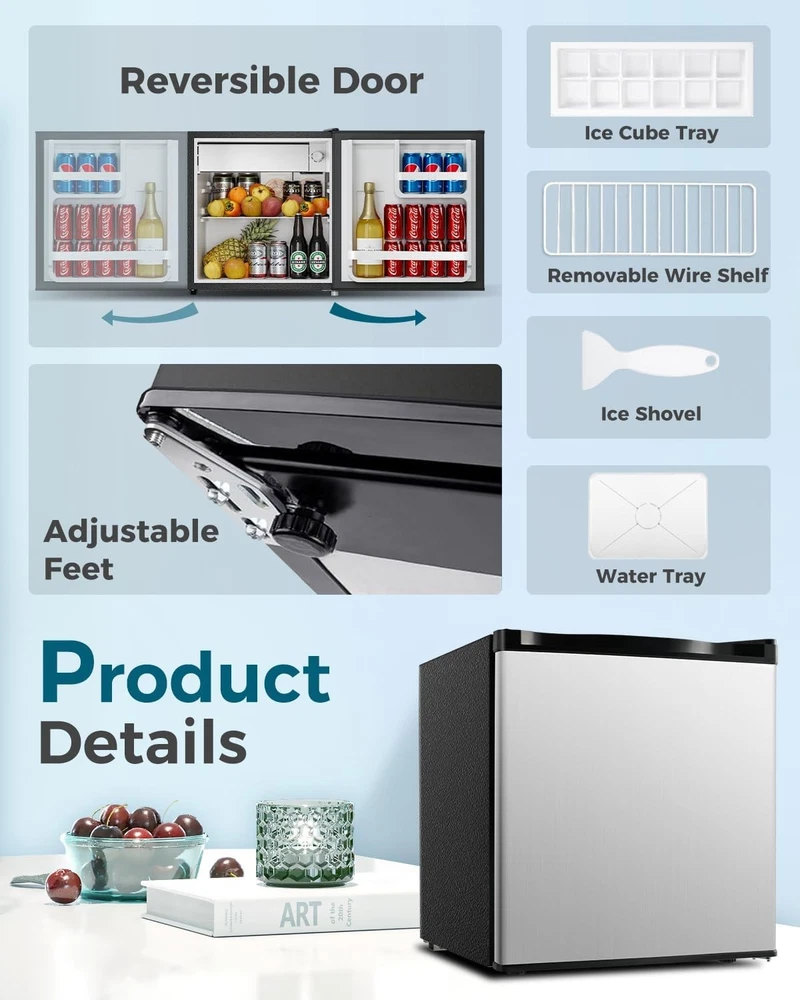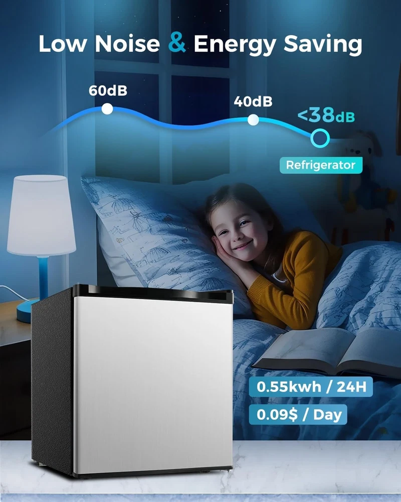 πŸ“Œ Condition: Open Box – PLEASE READ CAREFULLY πŸ”₯ FINAL CLEARANCE / BLOWOUT SALE – LAST UNITS πŸ”₯ This item is sold as OPEN BOX and part of a FINAL CLEARANCE SALE . ⚠️ COLOR IS SHIPPED AT RANDOM Color will be Black or Silver , selected randomly . No color choice. No exceptions. ⚠️ COSMETIC IMPERFECTIONS EXPECTED The unit may have visible scratches, scuffs, or minor dents due to handling, storage, or previous opening. πŸ‘‰ These are COSMETIC ONLY and DO NOT affect performance. The fridge has been tested and is fully functional . 🚫 IMPORTANT – PLEASE DO NOT PURCHASE IF: You expect a perfect, like-new appearance You are very picky about cosmetic condition You are a perfectionist regarding scratches or dents This item is NOT suitable for buyers concerned about appearance . ❗ FINAL SALE – NO RETURNS ACCEPTED Because this is a final clearance / blowout sale , NO returns, NO exchanges, and NO refunds under any circumstances. By purchasing this item, you fully understand and agree to all conditions stated above. Compact Size for Any Space - Our 1.7 cu. ft. small refrigerator measuring just 17.5"(W) x 16.9"(D) x 19.1"(H), offers a space-saving solution for any room. Its compact dimensions allow for flexible placement in bedrooms, offices, dorms, classrooms, home bars, apartments, and RVs. Easily store and access your favorite food, soda, beer, and beverages, maximizing convenience without compromising on space Mini Fridge with Freezer - This mini refrigerator features an efficient 1.5 cu. ft. refrigerator and a 0.2 cu. ft. freezer for all your storage needs. With specialized compartments for bottles, cans, and a removable shelf, it allows for customizable organization of fruits, vegetables, snacks, and ice cream, making it perfect for family life. Enjoy easy access to your favorite foods and beverages in this compact and versatile refrigerator Adjustable Temperature Control - This dorm fridge offers a wide temperature range (32℉-50℉) for tailored storage. With 7 precise cooling levels, you can effortlessly optimize the temperature for drinks, snacks, or fresh produce. The user-friendly thermostat knob makes it easy to find your perfect setting, ensuring your items stay fresh and ready to enjoy whenever you need them Low Noise & Energy-Efficient - Operating quietly at ≀38 dB, our bedroom mini fridge maintains a peaceful atmosphere for study, relaxation, or work environments. With energy costs as low as 0.55 kWh (about $0.09 daily), enjoy tranquil lifestyles in dorms, kitchens, game rooms, offices, and study areas – saving on bills while eliminating disruptive sounds Flexible Placement & Reversible Door - Our small refrigerator with freezer delivers maximum versatility through adjustable feet and a reversible door. Seamlessly fitting under desks or on countertops, this space-saving solution excels in tight spaces. This practicality makes it an excellent addition to your home or a thoughtful gift for friends and family looking for a reliable portable refrigerator Shipping & After-sales - Every mini fridge arrives quality tested with fast, secure transportation guaranteed. We provide 1-year accessory maintenance service to ensure your experience remains exceptional. For any product questions, contact us freely – we'll deliver satisfactory answers to keep your satisfaction at the fullest extent possible Product description