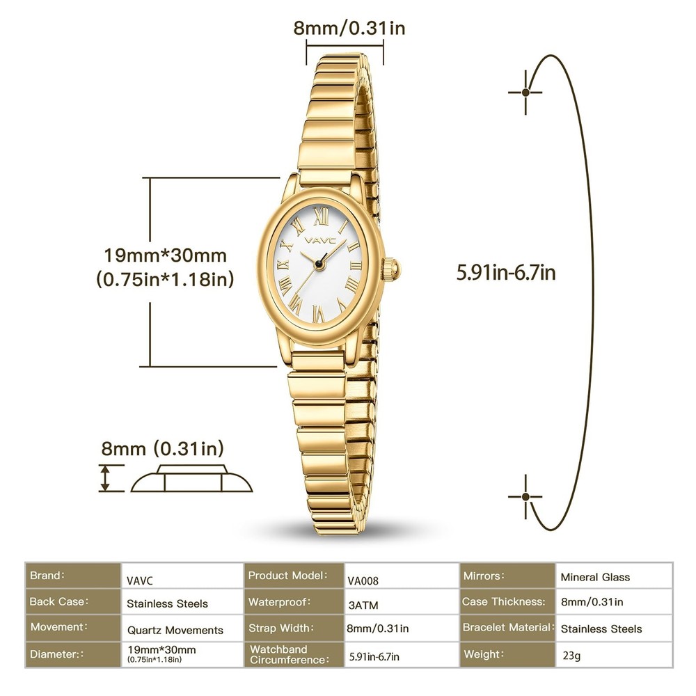Small Gold Watches for Women,Analog Womens Watch with Stainless Steel Expansion Band,Oval Case Roman Dial,Water Resistant Product Details Size: 5.91in-6.7in Color: Gold Brand: VAVC MPN: VA008 UPC: Does not apply EAN: Does not apply Package Dimensions : 6.3 x 2.95 x 0.75 inches; 5.93 ounces Item model number : VA008 Department : womens Date First Available : April 5, 2025 Manufacturer : VAVC Best Sellers Rank: #12,138 in Clothing, Shoes & Jewelry (See Top 100 in Clothing, Shoes & Jewelry) #13 in Women's Wrist Watches #13 in Women's Wrist Watches Customer Reviews: 4.4 4.4 out of 5 stars 158 ratings Brand, Seller, or Collection Name: VAVC Clasp: Expansion Band Model number: VA008
