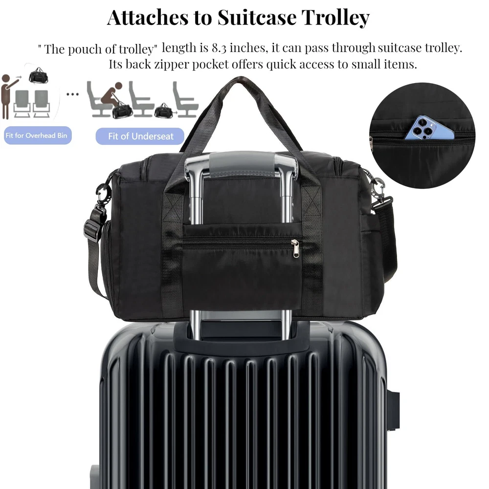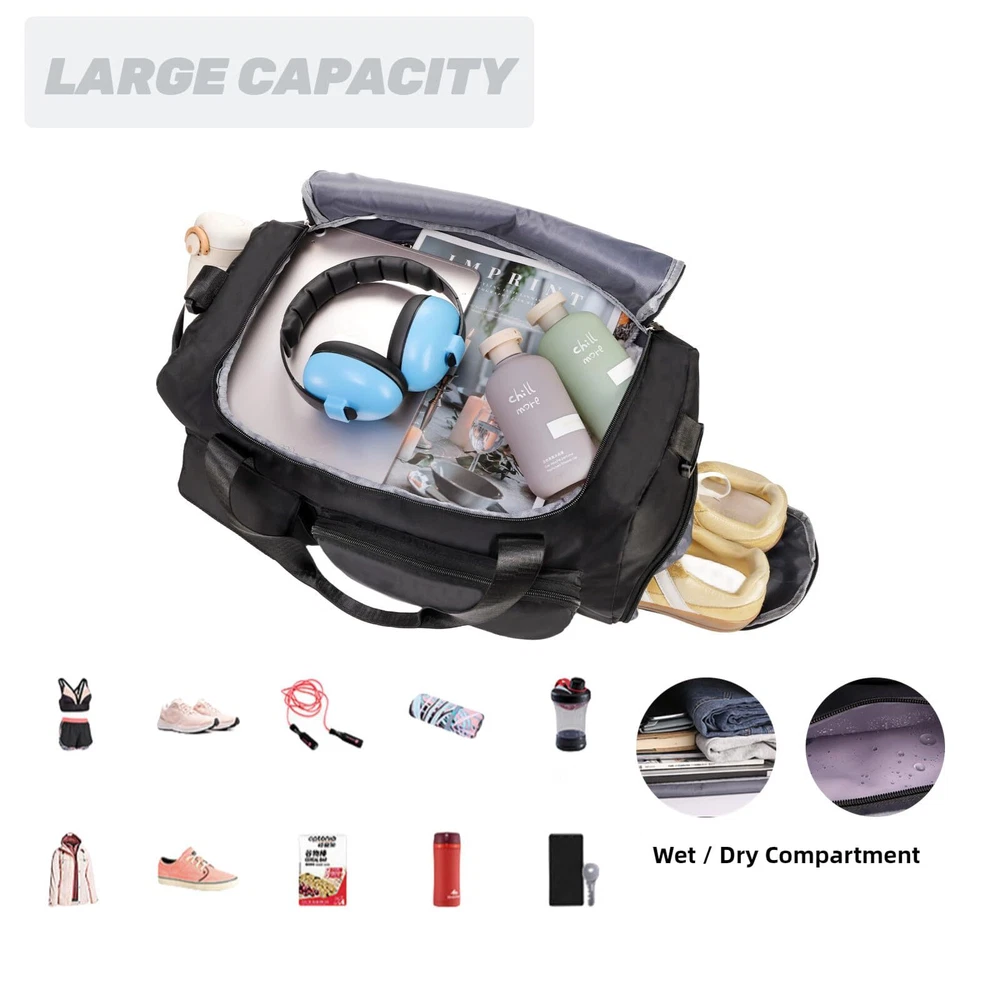 Durable and Waterproof: The gym bag is made of high-quality polyester fabric and nylon lining which are durable, waterproof, tear resistant and keep your belongings dry. Sturdy smooth zippers, exquisite workmanship and reinforced stitching at every key point ensures long-lasting use. Multi Pocket Design: These travel duffel bag includes 10 total compartments to plenty of items while keeping them neat and tidy. 1 main roomy compartment with 1 inner pocket, 2 front pockets, 2 side pockets,1 back zipper pocket, 1 back luggage sleeve and 1 removeable shoulder strap. Perfectly Sized: duffle bags measure about 18" L x 9.8" W x 11" H, which can hold a capacity of 37L. Enough space for clothing for a short trip. An ideal overnight weekend boarding bag for business or personal travel. Can be folded when not in use. 2 IN 1 Multipurpose Bag: Our lightweight gym bags can be carried in different ways, with comfortable hand grips and an extra over the shoulder strap if needed. It could be served for various sports such as tennis, dance, golf, football, basketball, swimming, etc. Dry Wet Separated Gym Bag: The black travel bag can help you separate dry and wet items, you can put your wet towels or dirty clothes into front pockets. The individual shoe compartment is ideal for keeping your shoes and will not stain rest of your belongings.