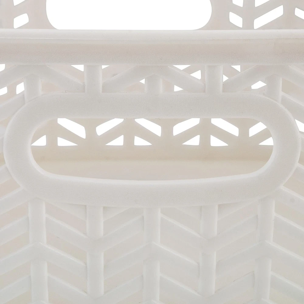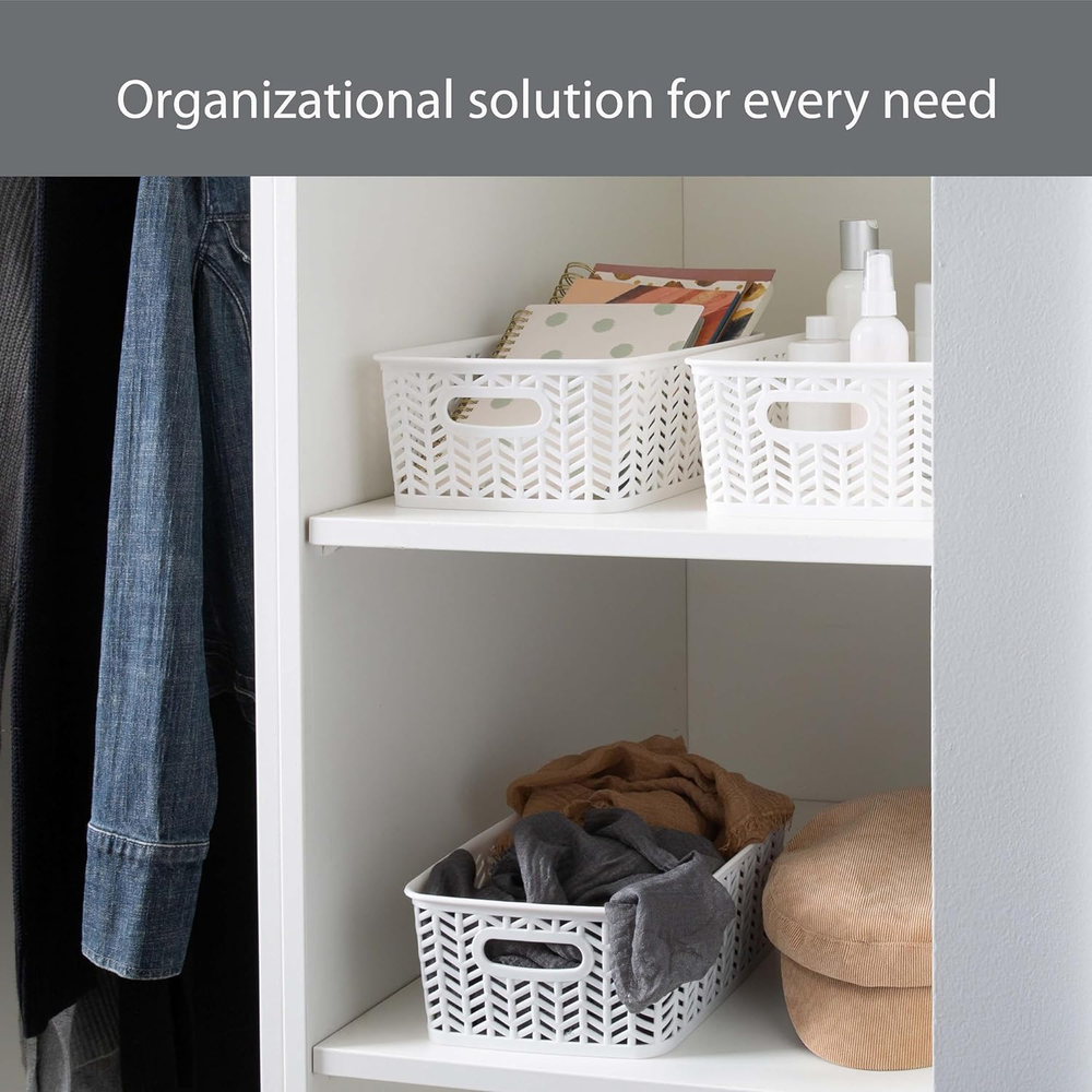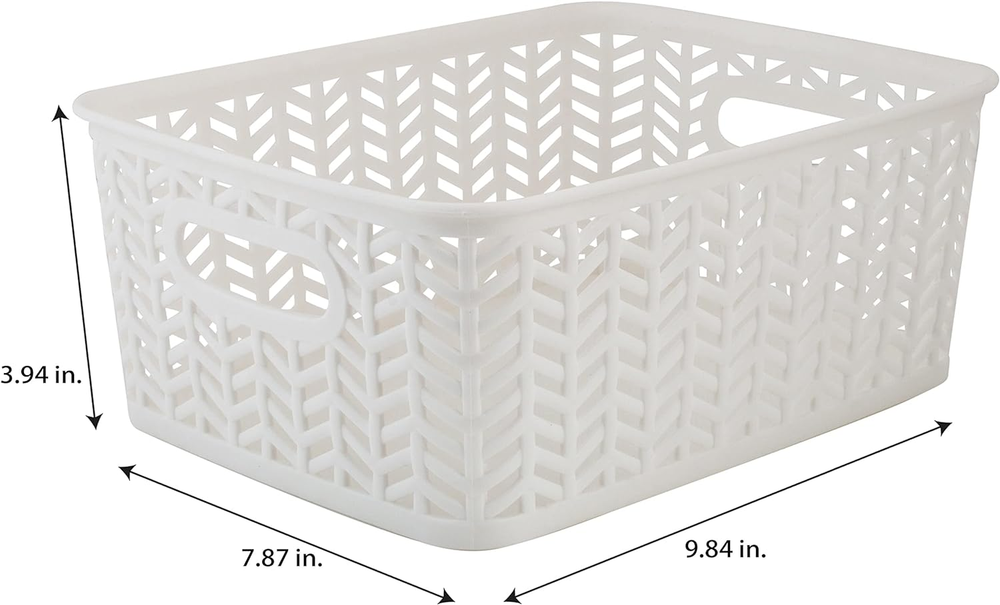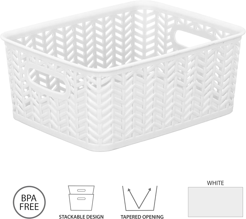 STURDY QUALITY DESIGN: Our Storage Tote Basket are made of high-quality polypropylene plastic with attractive herringbone style craftmanship that adds a warming touch to home décor. The open bin design allows easy view and access to your held items. CONVENIENT & MULTIFUNCTIONAL: The baskets are versatile for home and office organization. Organize office supplies, arts and crafts, playroom, laundry room, sewing room and more. 2 Open Handles: These baskets have two durable handles that are lightweight and easy to move to any room in the house. Dimensions: 10"x8"x4" Simplify's Herringbone Storage Bin has a unique wicker design and is made of sturdy polypropylene plastic. 2 sturdy open handles makes it easy to carry Bin around from one place to another. It has a lightweight design and holds a multitude of items, organizing and de-cluttering homes. Wide selection of colors to fit any setting.