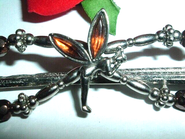 A small Lilla Rose silvertone hair clip with Tinkerbell and her amber glass wings framed in metallic brown and silver beads. Measures 2.5" wide with a 3" long pin back. Never worn, condition is excellent and perfect for spring. A wonderful gift for a little girl (or a big one).