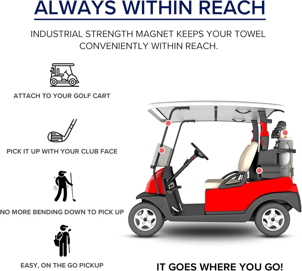 Magnetic Golf Ball Towel With Clip - Easily have your golf ball cleaner towel by your side at all times. With this convenient mini golf towel you can easily attach it to your belt with a clip or place it in your pocket. When you are finished on the green, simple tap the magnet with your golf club to pick it up. Golf Greens Towel - This portable golf towel is the perfect size for taking with you to the green for cleaning your golf ball. When you are done, simply tap the magnet with your club and it's like it was picked up by a ghost Golf towel has deep waffles for cleaning as well. Small Golf Towel - This pocket size golf towel is perfect for carrying with you at all times. It is also a magnetic golf towel so it can be picked up by simply tapping the magnet with your club and it will stick to your golf club for easy retrieval. Golf Ball Cleaning Towel - This small golf waffle towel makes cleaning your ball and golf sclubs easy. The deep waffles clean your ball easily and it also works great as a golf club cleaner towel as well. Greenside Golf Towel - The waffle golf ball towel ensures you do not have to carry around a large towel with you. This small pocket golf towel is easy to carry with you greenside and is the perfect size golf ball clean towel.