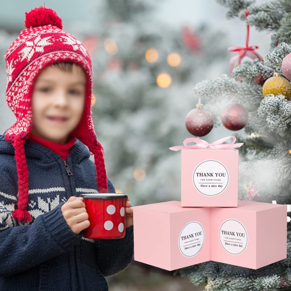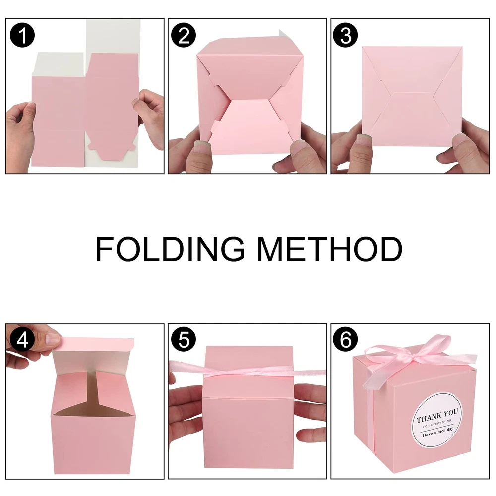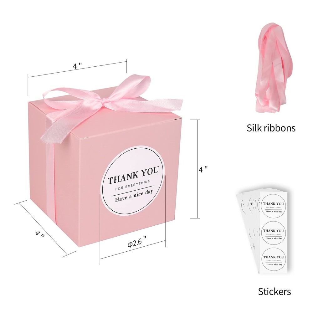 100pcs Wedding Favor Boxes, Paper Gift Boxes 4x4x4 Inches Small Gift Boxes with Ribbons Small Boxes for Gifts, Crafting, Cupcake, Candy, Bridesmaid Proposal Boxes,Easy Assemble Boxes Application: Imagining that what a romantic and elegant wedding gift when you present to your guest with this favor box. Perfect for wedding/ baby shower/ birthday/ kids party/ bridal shower/ christmas /garden party and holiday celebrations or other special event decorations etc. Specifications: Size: 4 x 4 x 4inch (L x W x H) Material: High Quality Oily Kraft Boxes Package including: 100 x Pink favor boxes 100 x Pink ribbons 100 x Thank you stickers Easy to DIY and personalize your gift ,decorate your treat presentation, a pretty displaying box for desserts, and take-out package from wedding or celebrations. Size:Wedding gift boxes :4"x 4"x 4" ,cube shape ,prefect size for homemade cupcakes ,candies, chocolates, cookies, jewelry, soaps ,and other small gifts. Material:The small boxes are made of high quality oily kraft boxes, ultra thick.and come with free Ribbons for gift bows. assembled easily. These exquisite party favors boxes will make your party memorable. Wide Occasions: Paper boxes are great for wedding/ baby shower/ birthday/ kids party/ bridal shower/ christmas /garden party and holiday celebrations.They also can be use as a cupcake box ,favor boxes ,candy boxes or gold gift boxes. Create your own unique small gift box for your family and Ffriends ,They will remember and cherish forever.Leave a good memory! What You'll Get: 100pcs pink favor boxes,100pcs pink ribbons and 100pcs Thank you stickers. you can tie a bow knot on top, which will be more elegant and romantic for party. Easy to Assemble :They are come in flat and pre-folded,easy to be assembled, and are strong enough to hold small glass jars or cups. The neat box design makes them the ideal solution for awkwardly shaped gift items.