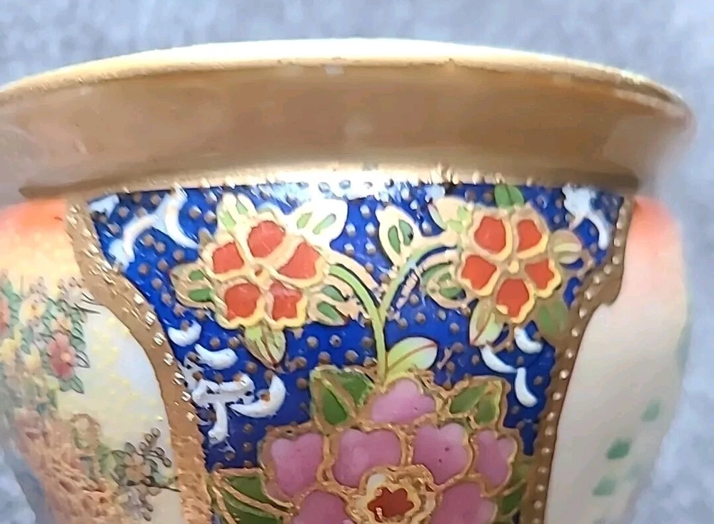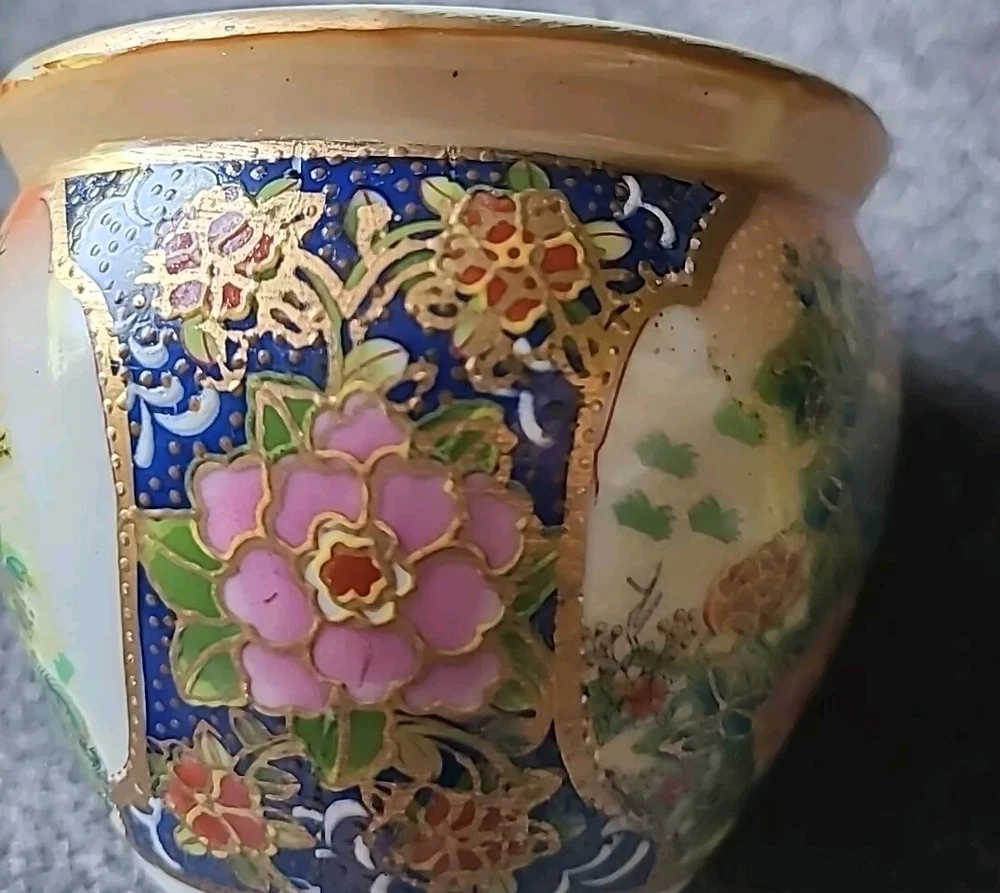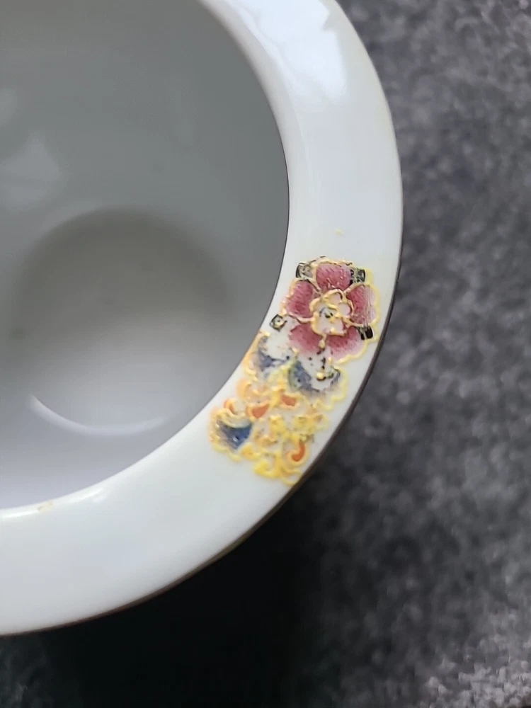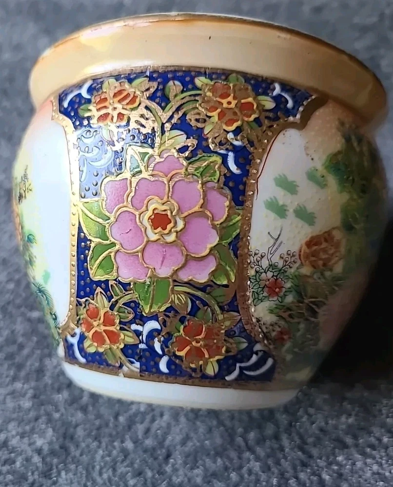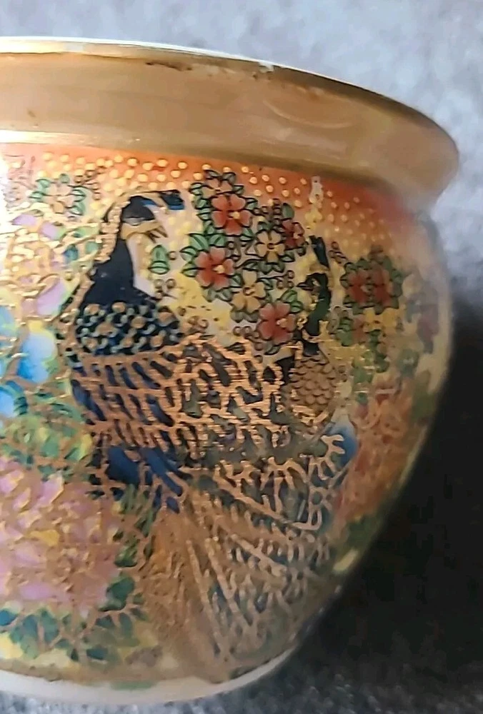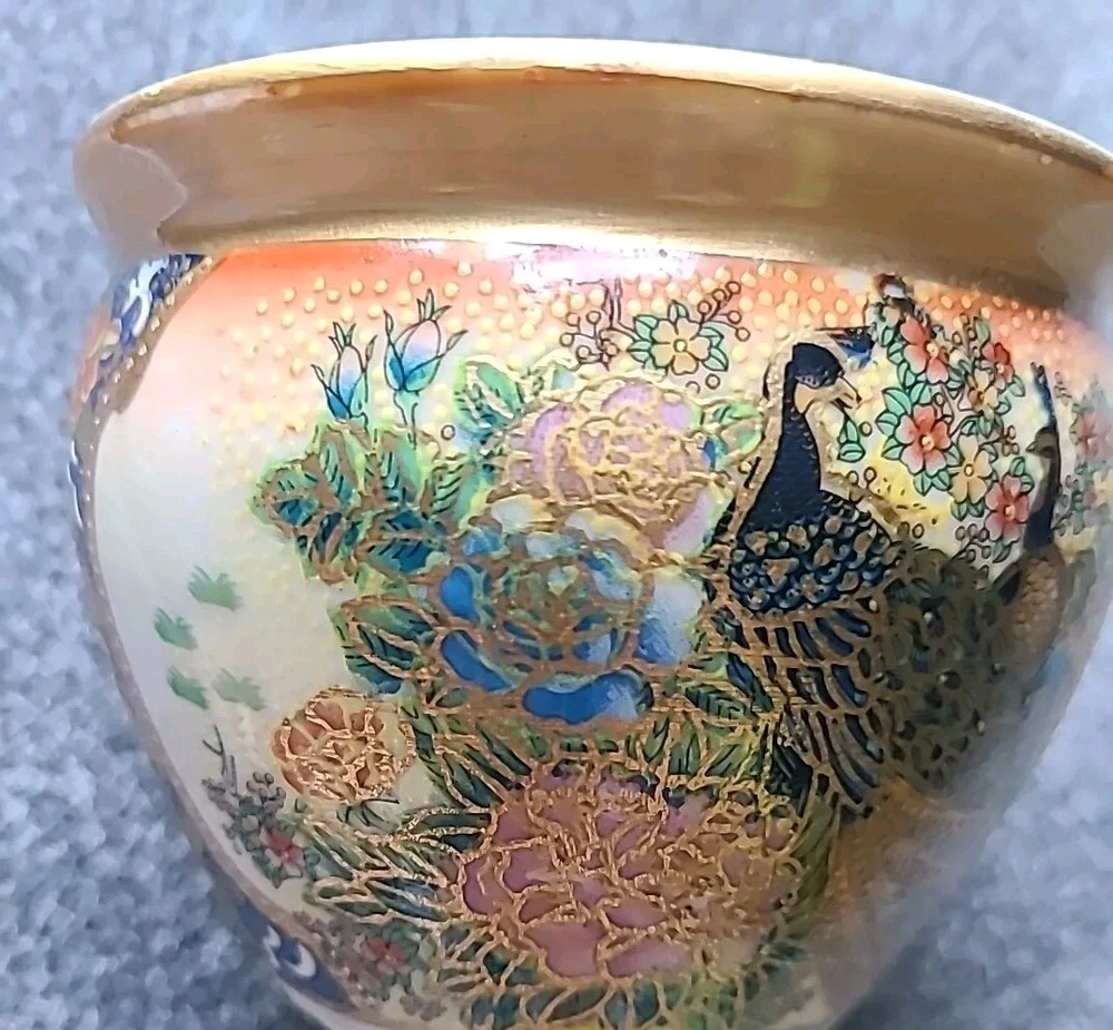This small pot/vase features a peacock and nature scene design in multi-color porcelain. It is inspired by vintage Oriental aesthetics, with gold-like accents. The height is 3.5 inches, originating from China. The theme includes peacocks and flowers. The specific Chinese dynasty and age are unknown, as well as the maker of the item.