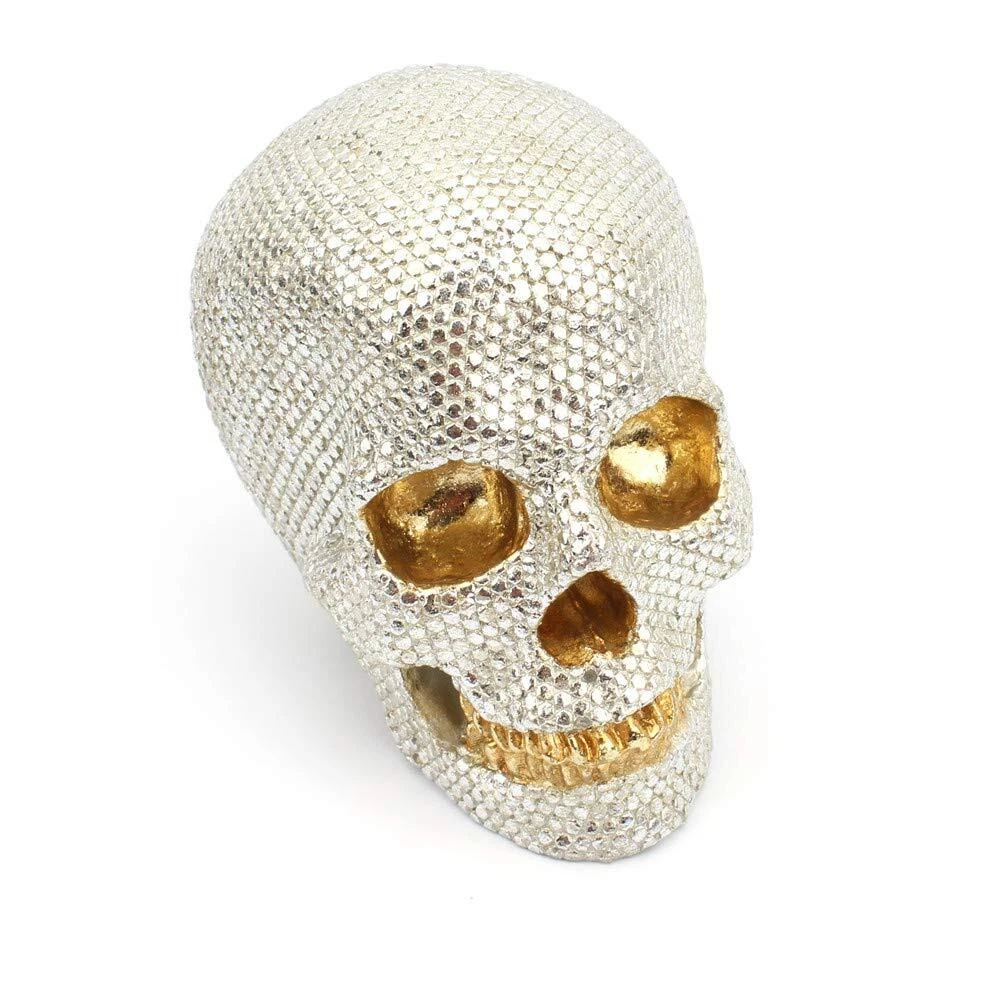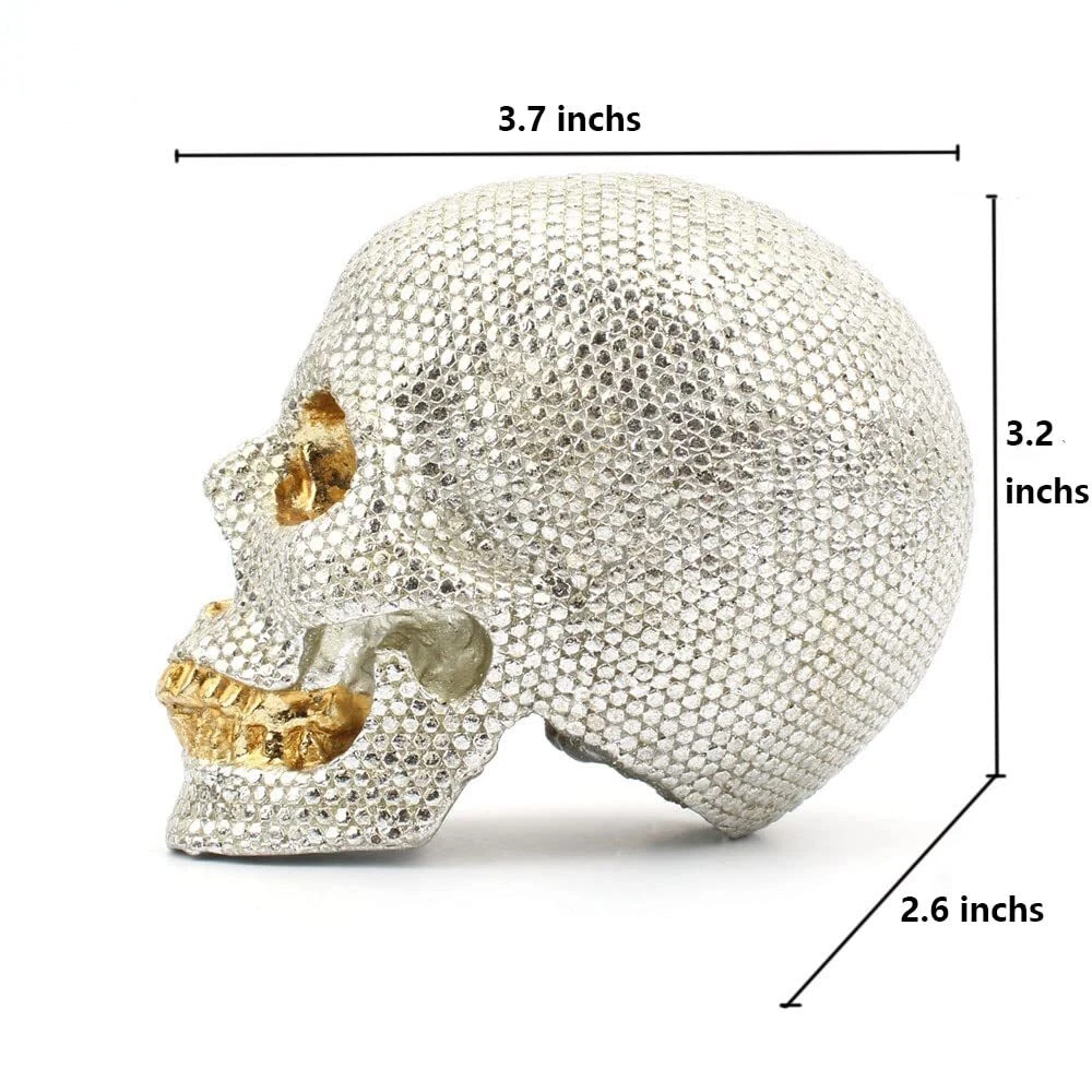 Small Size Human Skull Resin Statue Head Sculptures Skull Collectible Figurines This skull organizer is made of designer composite resin, hand painted and polished individually. Halloween Crystal Skull Figurine A dazzling artificial water drilling chrome bone. It has a shiny factor on the skull, no matter where you decide it, it will give a beautiful factor. Set it with your candles to get beautiful illumination reflections! Decorate your home for the halloween, day of the dead season or any season with this skull. This Collectibles makes a great gift for any Skull lover and adds a whimsical touch to your Decor.