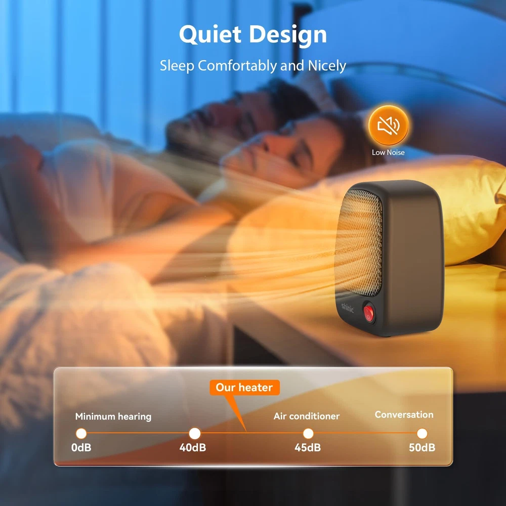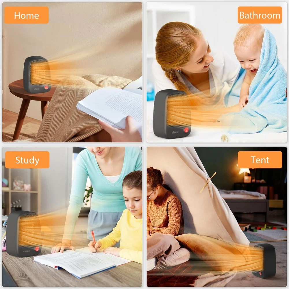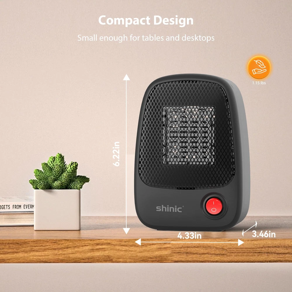 COMPACT AND PORTABLE:The small heater measures just 4.72"D x 4.33"W x 6.69"H, lightweight but powerful. You can easily move it around, perfect for office desk, bedroom, living room,dorm and other small space. HIGHER HEATING EFFICIENCY:With upgrade PTC ceramic heating technology, this space heater Improves heating efficiency while reducing energy consumption, thus saving electricity bills. It can quickly heat up an area of 43 square feet within 3s. MULTI SAFETY PROTECTION:Designed with tip-over and overheat dual protection, it will turn off automatically if it tilted or overheated to effectively avoid fire, or any other accidents. Plus, safety plug are certified by ETL, ensuring your safety with every use. COMFORTABLE AND QUIET:Thanks to low noise motor technology, this portable heater is remarkably quiet, noise level below 45 decibels, which provides a quiet, warm, comfortable enviroment to you without disturbing your studies, work, and sleep. EASY OPERATION:The heater has only one power switch, which is very easy to control and Simply plug it into a standard 120V wall socket to start it up. When not in use, it is also very easy to store without taking up much space. AFTER SALES:We offer 1 year warranty service, If you have any questions after receiving the heater, please contact us immediately, We will reply within 12 hours.