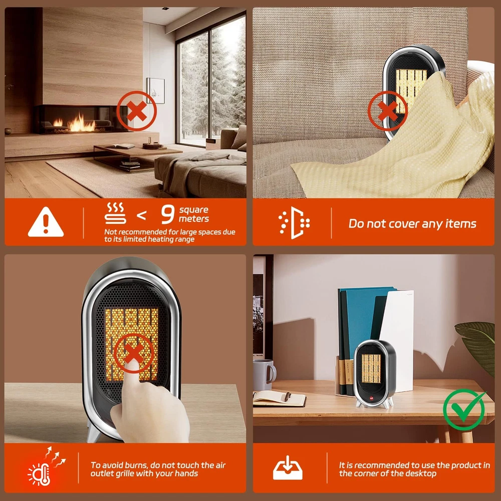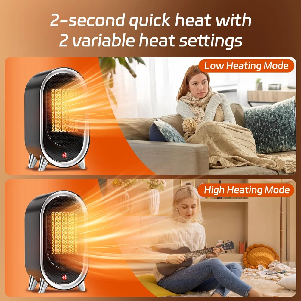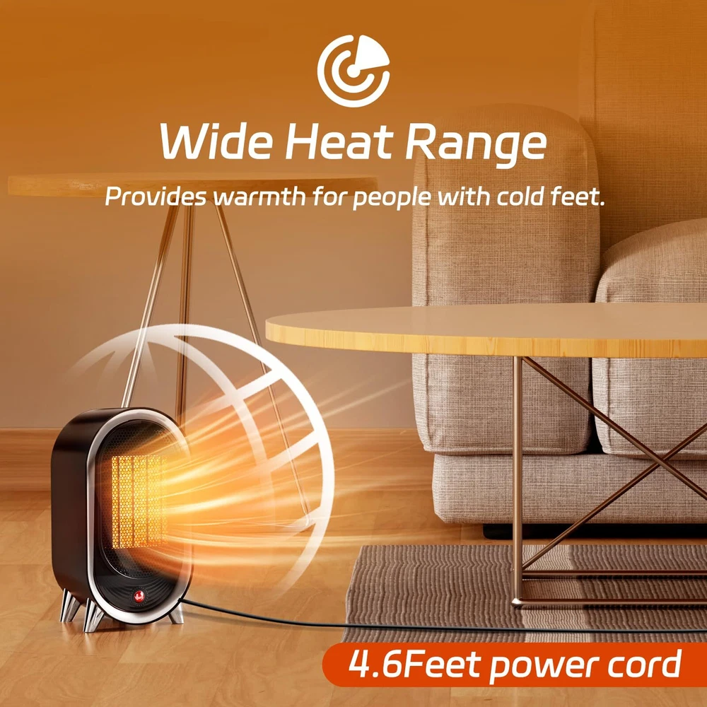 【Get Cozy Quickly】This small space heaters for indoor use warms up and distributes heat evenly in just 2 seconds. Simply turn it on, and in a 10-second countdown, your small room, desk area, or bedside will be comfortably warm. Its 900W power design ensures efficient heating while helping to manage electricity costs, and its sleek, elegant appearance blends seamlessly with your room’s decor. The high-quality PTC material better prevents wear and tear, ensuring long-term, reliable performance and lasting warmth 【Advanced Safety Protection】Safety is built into every aspect of this small space heater. The small heater for bedroom features advanced safety measures, including overheat protection that automatically shuts off at 158°F and tip-over protection that prevents accidental tipping.High-precision PTC ceramic heating further ensures reliable, worry-free operation 【Portable Convenience with Stylish Appeal】Perfectly designed for both practicality and style, our heater for bedroom compact size (4.7" x 5.5" x 11.2") and hidden handle make it easy to move from room to room. Available in two colors (white/black), it fits seamlessly into any decor while offering the convenience of portable warmth for any small space 【Quiet and Friendly Operation】Operating at no more than 45 dB, this office heater under desk quiet provides a quiet and serene heating experience. It includes user-friendly features such as a high-temperature resistant air outlet to prevent burns. Designed for peaceful environments, this heater ensures safe and effective operation with its gentle heating design 【Flexible Heating for Compact Areas】Whether you need heat in a small indoor area or an space heater office, this space heater indoor covers up to 96.9 sq. ft. Its mini size and lightweight design make it easy to transport and place wherever needed. Enjoy tailored warmth in homes, bathrooms, bedrooms, nurseries, cozy reading nooks, small workshops, or even your pet's favorite resting spot. The small heaters for indoor use is a practical choice for year-round comfort in any compact setting