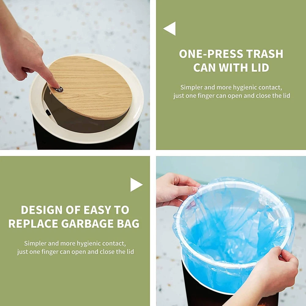 -Bathroom Trash Bin Hide the ugly plastic bag and hide all the ugly looking trash. Trash can with lid is well sealed, prevent odor, you don't see the trash bag hanging over the sides of the indoor trash can. -Multi-functional Kitchen Garbage Can This baby/pet proof garbage can is quite suitable to be placed in a narrow space such as any slim area in the kitchen or bathroom, which can help us to save room space. -Privacy Garbage Can Intimate design odor proof trash can is well sealed, prevent odor. It tucks into small spaces nicely and does a pretty good job hiding odors as well. -Waste Basket for Multi-functional Occasions Touch to open, designed with a quiet lid closure so there’s no noisy each time the lid closes. That is the nice size for restroom, bedroom, living room, office, kitchen, bathroom. It is a good gift for Christmas, Halloween, Thanksgiving, Mother's Day, Father's Day, birthday, and wedding anniversary! Service Guarantee: -Before shipping, we will carefully check each product, and it will be well packaged. Ensure that customers receive the well product. -If you have any questions, please don't hesitate to us. We will reply you within 24 hours. Note: -The actual color of the product may be slightly different from the picture due to the difference in monitor model or shooting brightness. -Due to the different measuring instruments, please allow the deviation within 1-3cm. 🚮MATERIAL & SIZE: This Office Bedroom Bathroom Trash Can (8.66"W x 14.3"H) is made by durable PP material which is sturdy & waterproof and supported by three artificial wooden legs. 🚮PERFECT FOR SMALL SPACES: This 7 liter/ 1.8 gallon trash can fit to limited space or narrow space specially, is the nice size for bathroom, bedroom, office, kids room, living room, toilet, apartments, condos, campers, RVs, dorm rooms, cabins and tiny homes and other small spaces. 🚮SOFT CLOSE LIDE TRASH BIN: Touch to open, designed with a quiet lid closure so there’s no noise each time the lid closes. Also, the trashcan is designed so well that it perfectly hides ugly trash bags and your privacy, such as feminine products or dog poop bags. 🚮ANTI-ODOR, BABY, PET PROOF TRASH CAN: Garbage can with lid effectively block the smell of trash, take care of your home health, and prevent pets from overturning the trash can. 🚮EASY TO CLEAN: The use of high-end plastic and sturdy wooden legs, the circular design allows you to clean better, and the humanized inner gasket makes it easier to replace the trash bag.