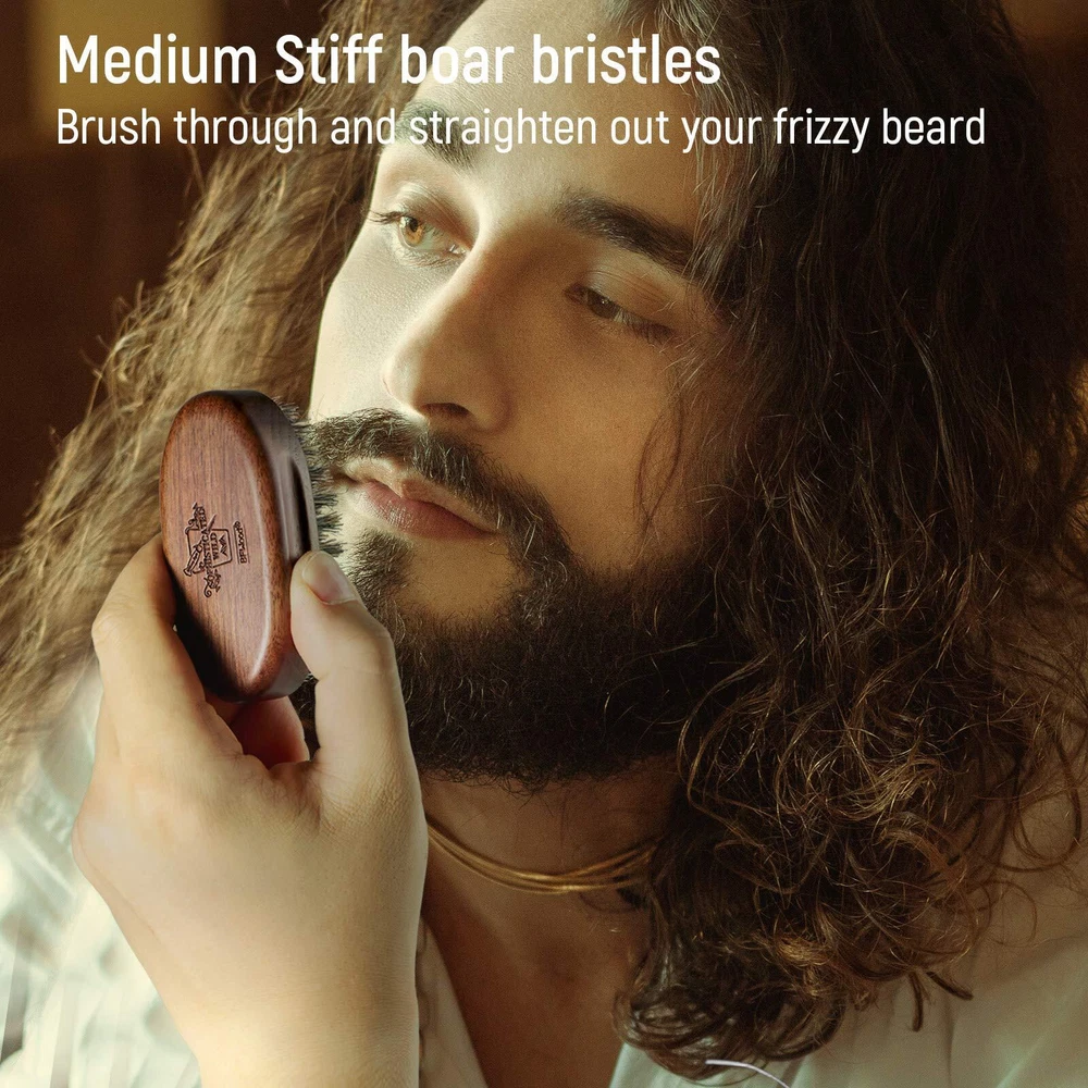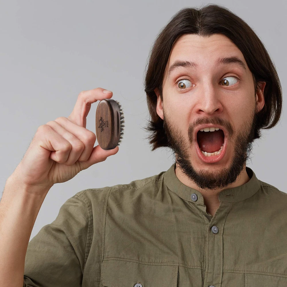 Dimensions: 1.57 x 3.35 x 1.42 in; Bristle Length: 0.59 in Oval shape, thick base, indentations on the side for better grip. Medium-stiff boar bristles evenly distribute oils throughout the facial hair to prevent dryness and itchiness. Pocket-sized beard brush fits into any bag; ideal for on-the-go beard care. How to clean: First pull out any remaining hair from the brush, then place the brush, bristles down, into a shallow soapy bath. Be careful NOT to immerse the wooden part of the brush in water or it damage the wood. Finally, rinse with clean water, place the brush on a cloth with the bristles facing down, and let it dry overnight.
