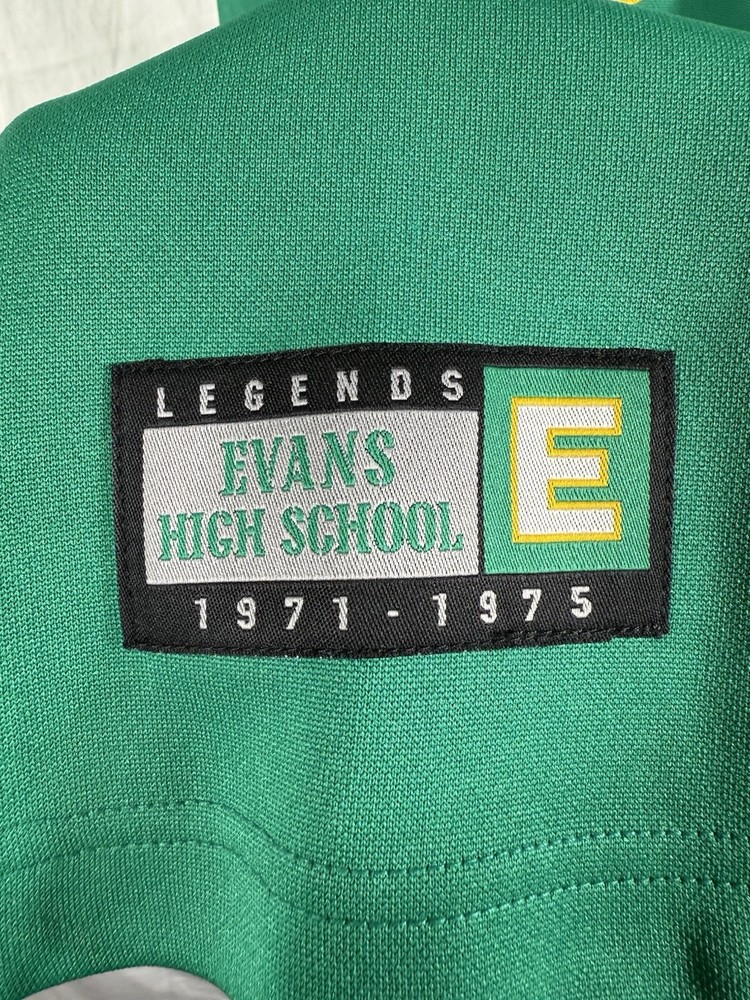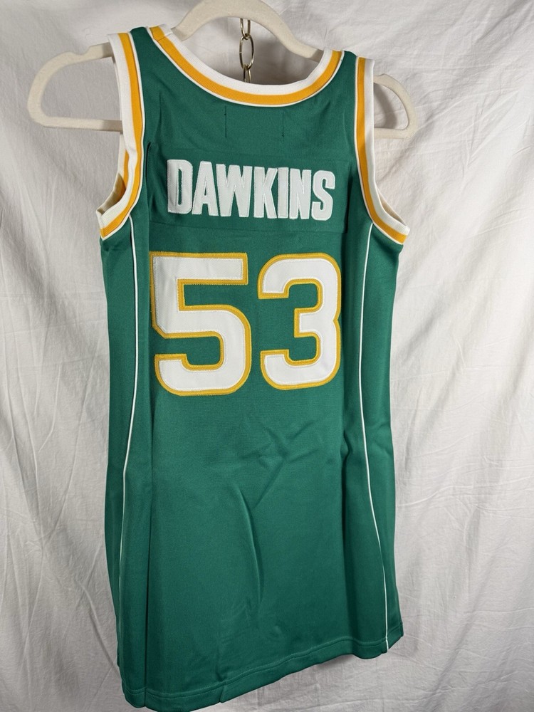 The product is a small size Darryl Dawkins Evans High School cheerleading dress in green color. It is officially licensed by Varsity Legends and features the player's name on the front. The dress is part of the National Basketball Association (NBA) collection, specifically designed for women fans of the team. This vintage dress is brand new with tags, making it a unique and collectible item for fans of both Darryl Dawkins and Evans High School basketball.