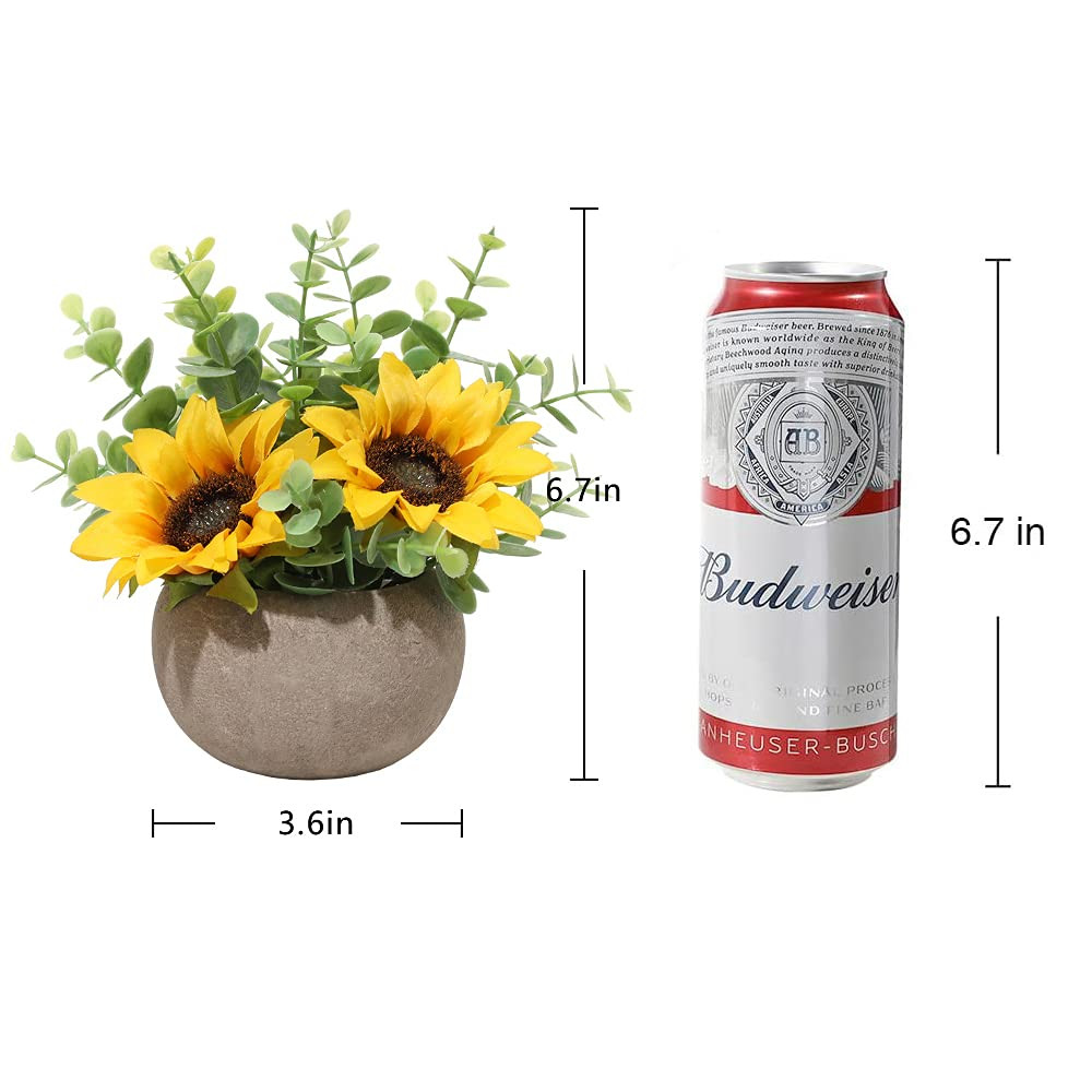 đ» ăWhat is inside the packageă When you receive the package, you will be pleasantly surprised to find 10 eucalyptus leaves, 2 fake sunflower heads, 1 sunflower leaf, and 1 cement pot inside. You will experience a feeling of happiness from sunflower bathroom decor. đ» ăExciting Appearanceă Our small artificial potted sunflower use eucalyptus leaves, which make them more vivid and vibrant, giving them a natural appearance. Sunflowers kitchen decoration are full and their leaves are clear, giving people a feeling of being bathed in sunlight. đ» ăSunny and cheerful moodă The representative of sunflowers for home is WARMTH/LOYALTY/SUNSHINE//POSITIVITY. When you see them, you will feel relaxed and full of vitality. đ» ăEasy to handleă: Our small sunflower in pot do not require watering or wilting, and are easy to manage. đ» ăAvailable Scenariosă Fake small flowers with vases - arranged with fake sunflowers and eucalyptus trees, are a versatile core decoration that is perfect for enhancing various settings in your home, bathroom, kitchen, living room, farmhouse, party, bedroom and outdoor space. Whether you place it on a sink, windowsill, bookshelf, or table, this exquisite artificial autumn flower decoration can add a touch of elegance and warmth to any environment.