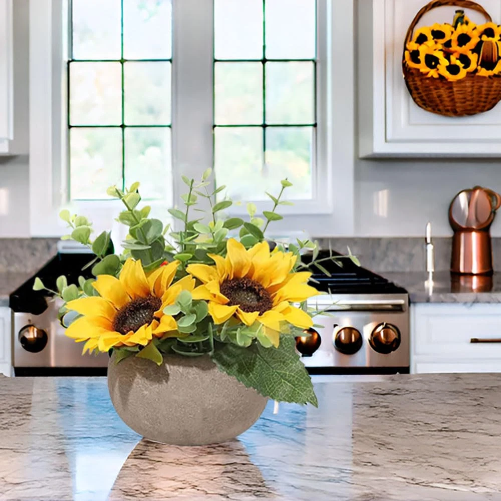 Absolutely love these cheerful sunflowers! The set comes with everything you needârealistic eucalyptus leaves, bright sunflower heads, and a sturdy cement pot. They add such a vibrant, natural touch to any space, whether itâs the kitchen, bathroom, or living area. The details are stunning, and they look so lifelike. No watering needed, just pure sunshine vibes all year round! Perfect for anyone who wants a pop of color without the hassle. Highly recommend!