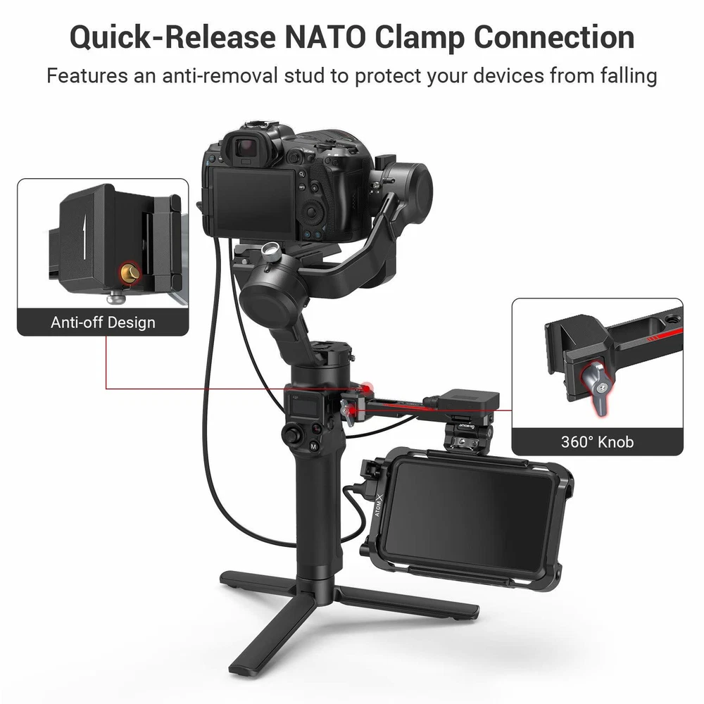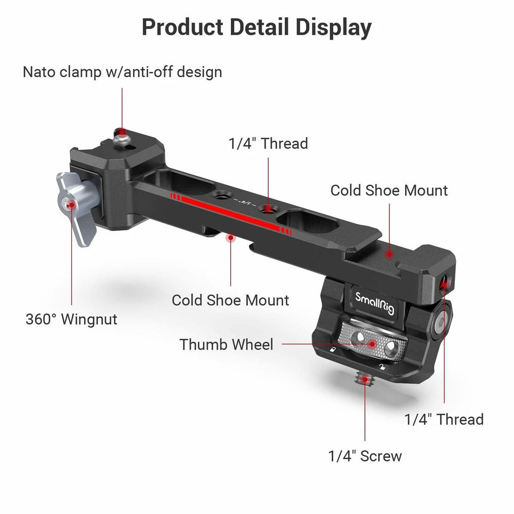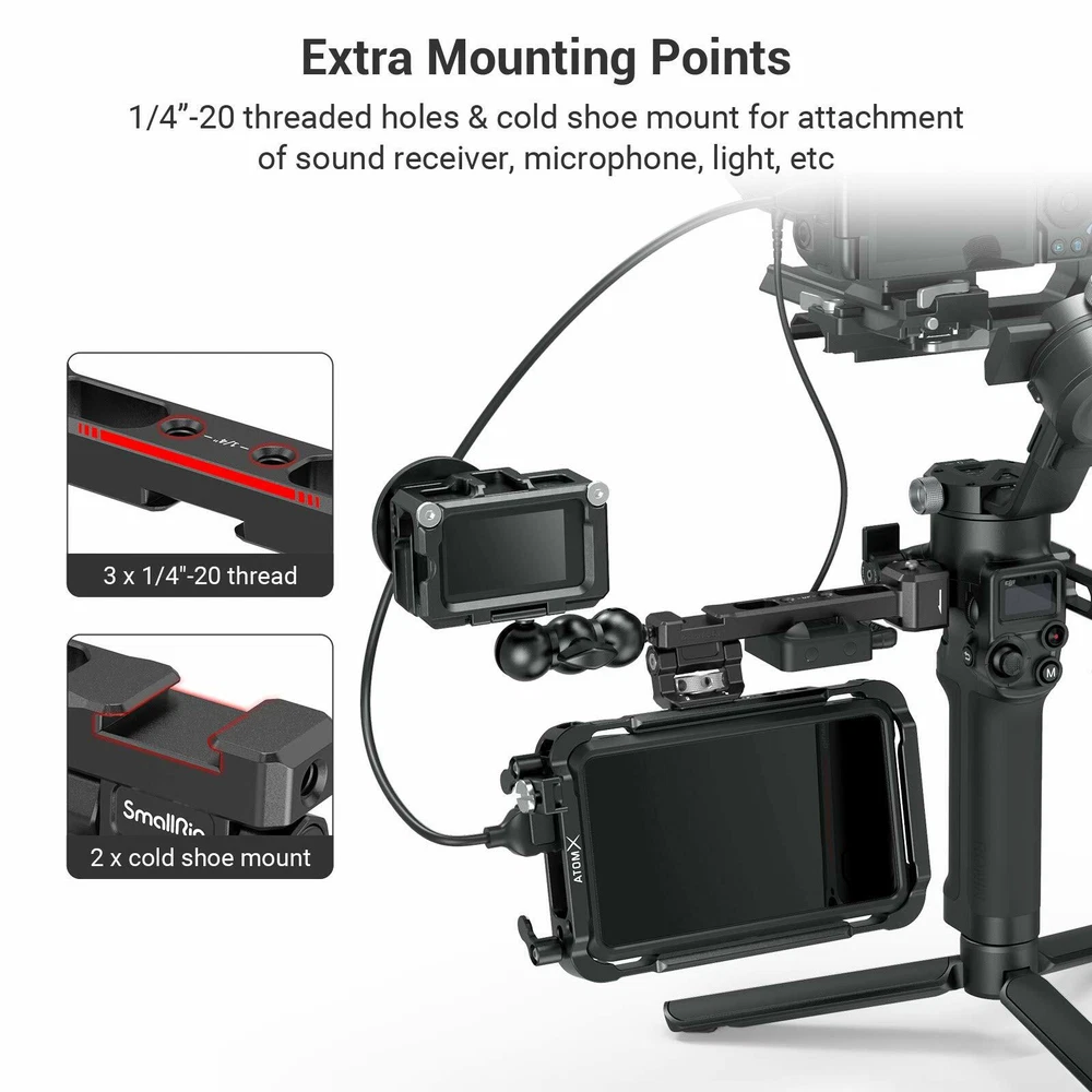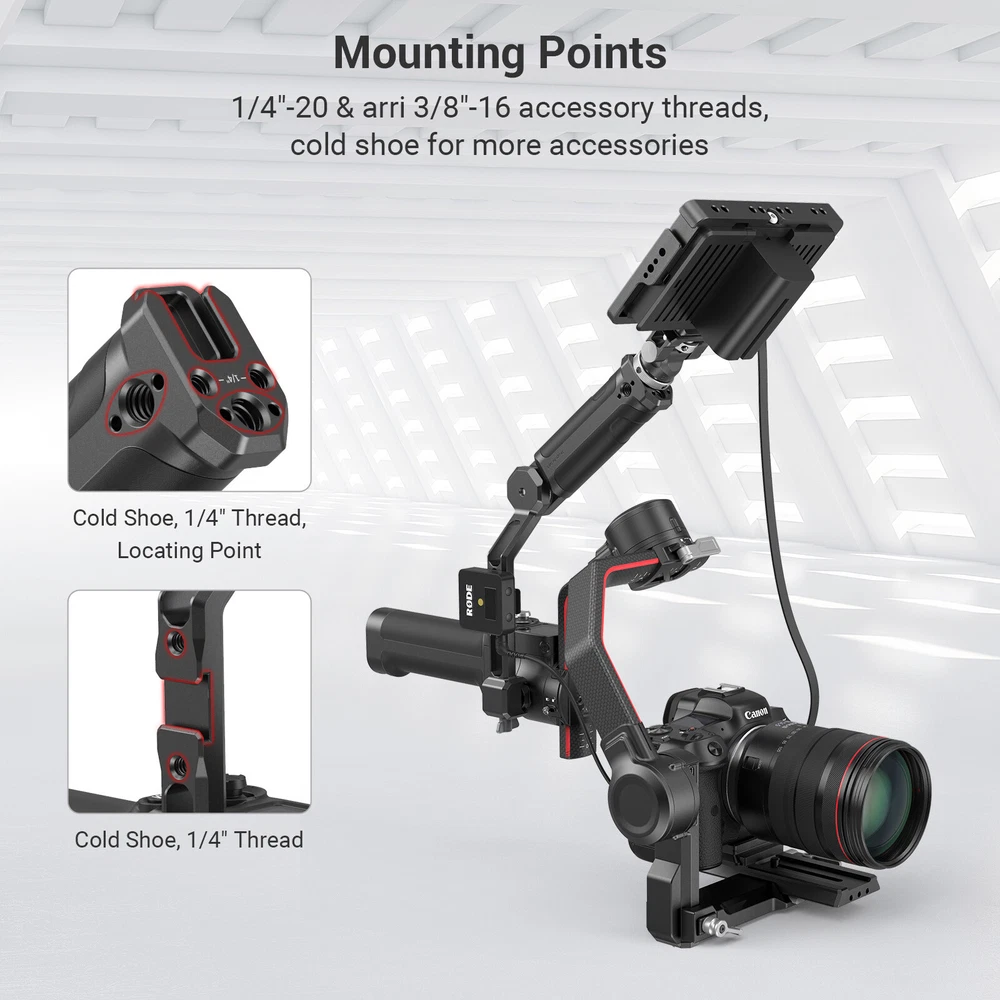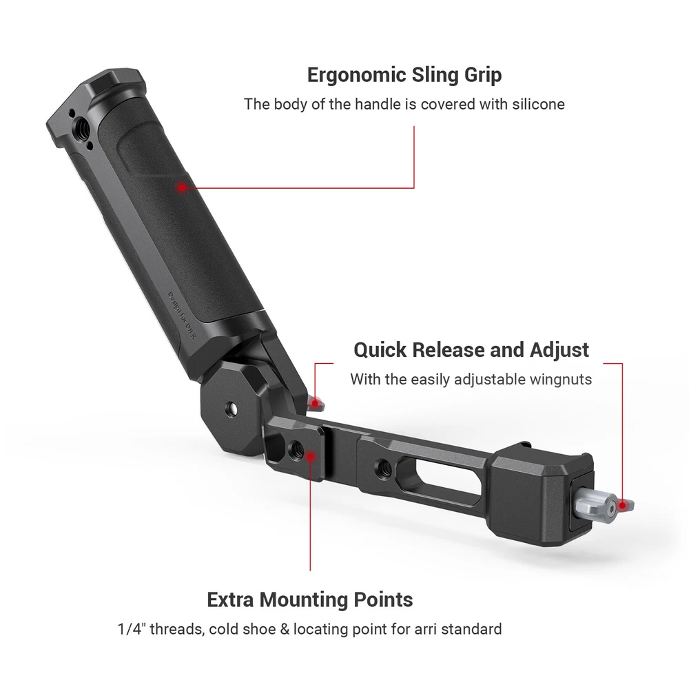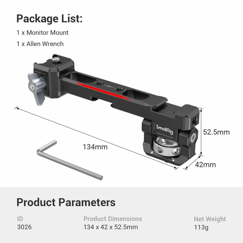DESCRIPTION SmallRig Sling Handgrip for DJI RS 2/RSC 2 3028 SmallRig Sling Handgrip for DJI RS 2/RSC 2 3028 Key Features: 1. Sling handle with NATO clamp for DJI RS 2 and RSC 2. 2. Designed to reduce arm fatigue, especially for low-angle shooting. 3. Built-in 1/4”-20 threads, ARRI 3/8”-16 locating holes, and cold shoe accessory mounts. 4. Tighten by ratchet knob, angle adjustable up to 180° with rosette. 5. Matte surface perfectly matches the industrial design of the stabilizer. SmallRig Sling Handgrip for DJI RS 2/RSC 2 3028 is designed to reduce arm fatigue during low-angle shooting and offers plentiful accessory mounting options. Equipped with a NATO clamp for connection and features an anti-removal stud to ensure safe and quick operation. Multiple 1/4”-20 and ARRI 3/8”-16 threads are built-in on the handgrip which allows for mounting Monitor Mount 2903 . Features 1/4”-20 thread with locating holes which is compatible with DJI RS 2 original smartphone mount. The handgrip comes with a cold shoe mount on the top allows for attaching the Monitor Mount 2905 , and the connection part features a cold shoe mount for attaching wireless go or sound receiver. The angle of the handgrip can be adjusted up to 180° via a ratchet knob and can be used as a side handgrip to meet the needs of different shooting scenarios. It can work with SmallRig Shoulder Strap KPAC2466 to reduce the arms burden. The silicon grip is an anti-slip design and gives you more comfort when holding it. Its sleek design and compact structure match perfectly with the stabilizer. Notice: Max Payload: 6 kg Designer: Yetta White Compatibility: DJI RS 2 DJI RSC 2 DJI RS 3 DJI RS 3 Pro DJI RS 3 mini Packing List: 1 x Sling Handle Product Dimensions: 185 x 69.5 x 43mm Package Dimensions: 210 x 55 x 55mm Net Weight: 295g Package Weight: 342g Material: Aluminum, Silicon DESCRIPTION SmallRig Monitor Mount with NATO Clamp for DJI RS 2/RSC 2 3026 Key Features: 1. Designed for DJI RS 2/RSC 2 stabilizer. 2. Plentiful mounting options for attaching a monitor, action camera and sound receiver, etc. 3. Monitor can be adjustable with a tilt angle of about 165° and can be stopped at any angle without tools. 4. Build-in 1/4”-20 threaded holes, dual cold shoe. 5. Clamps to each side of RS 2&RSC 2 via quick-release NATO clamp with anti-removal stud. 6. Matte surface perfectly matches with the industrial design of the stabilizer. SmallRig Monitor Mount with NATO Clamp for DJI RS 2/RSC 2 3026 is designed for adding accessories on both sides of the stabilizer, such as to monitor, light, sound receiver, wireless device, action camera, etc. Monitor mount can be installed on two sides of the stabilizer by NATO clamp and features an anti-removal stud to protect your devices from falling. There are two 1/4”-20 threaded holes on top of the monitor mount, and one 1/4 threaded hole on side of it, which can be attached with Magic Arm 2163 for action camera or other rigs. On top and bottom of it, there is one cold shoe mount that can be attached with a sound receiver, microphone, light, etc. The monitor mount is adjustable for 165° and can be stopped at any angle. With its compact structure and consistent design to match RS 2, it is a perfect match with the stabilizer.SmallRig Monitor Mount with NATO Clamp for DJI RS 2/RSC 2 3026 only for RS 2/RS C2; if you need to connect to Zhiyun and DJI stabilizer, please purchase 2386 . Notice: max. payload 1.5kg Designer: Yetta White Compatibility: DJI RS 2 DJI RSC 2 DJI RS 3 DJI RS 3 Pro DJI RS 3 mini Packing List: 1 x Monitor Mount 1 x Allen Wrench Product Dimensions: 134 x 42 x 52.5mm Package Dimensions: 185 x 55 x 55mm Net Weight: 113g Package Weight: 161g Material: Aluminum Alloy Brand SmallRig Type Handgrip & Monitor Mount To Fit Camera Compatible Brand for DJI Compatible Model for DJI RS 2, for DJI RSC 2, for DJI RS 3, for DJI RS 3 Pro, for DJI RS 3 mini Features Sling handle with NATO clamp, Quick Release Clamp Connects to Gimbal Model 3028B+3026 MPN 3028B+3026-Handgrip & Monitor Mount Material Aluminum, Silicon Compatible Series for DJI RS 2 Series, for DJI RS 3 Series Country/Region of Manufacture China