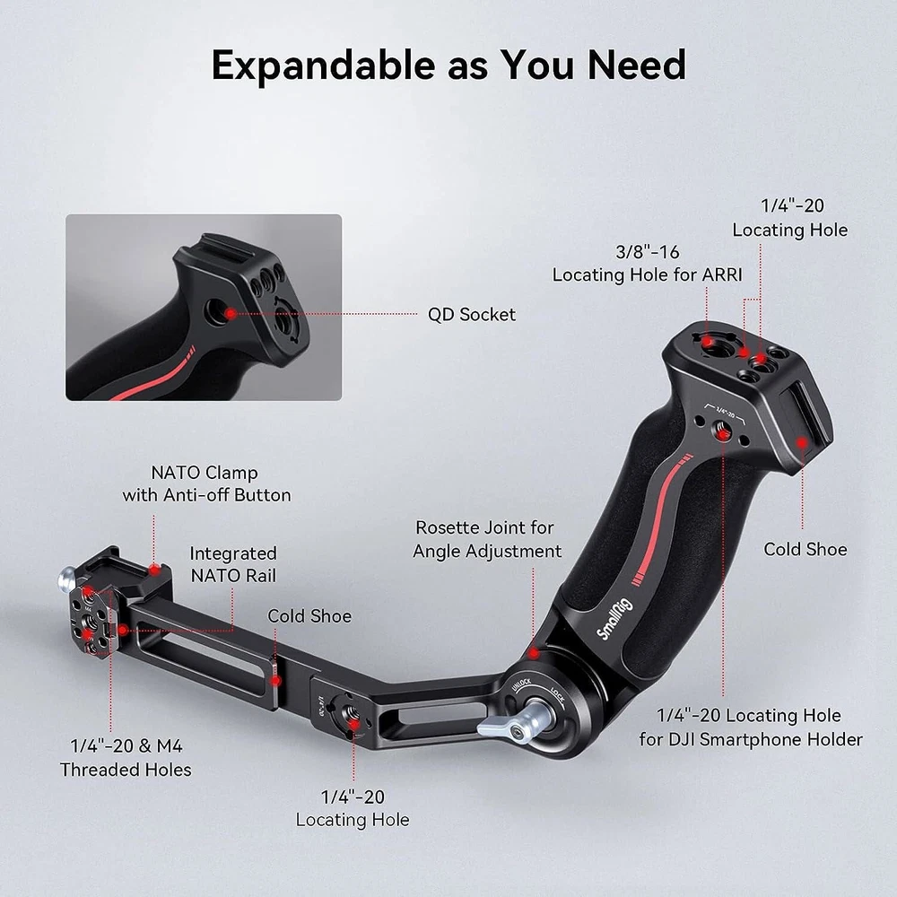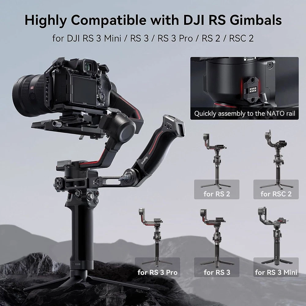 SmallRig Sling Handgrip for DJI RS 2|RSC 2|RS 3|RS 3 Pro|RS 3 mini 3028 About this item For DJI RS 3 Mini / RS 3 / RS 3 Pro / RS 2 / RSC 2 : SmallRig Sling Handgrip 3028C designed for the DJI RS series reduces arm fatigue and adds stability to low-angle gimbal shots. It can support up to 8 kg / 17.6 lbs and adopts a longer arm bracket, making it more versatile for RS 3 Pro and larger camera setups. Optimized Ergonomic Design : This gimbal sling handle has been updated with a curved design that better fits ergonomics. Its grip length has been increased with finger stops, providing a more comfortable and secure grip for larger hands. Constructed with a combo of silicone and aluminum alloy, it is lightweight but strong. Its sleek design and compact structure match perfectly with the stabilizer. Quick Release Features : It securely attaches to your gimbal with a NATO clamp, with anti-removal stud for safe and quick operation. On this version we integrate a NATO rail on the side, allows for mounting SmallRig 3026B to provides a good spot for your monitor. Additionally, a QD socket is added, providing the option to mount a QD neck or shoulder strap for additional support. 180 Degree Adjustment : SmallRig gimbal handgrip offers 180° adjustment through its built-in rosette joint, giving you the flexibility to shoot from various angles and reducing the strain on your arm. The rosette joint can be detached, allowing you to use the handgrip on its own as a rosette handgrip. Abundant Mounting Points : It features multiple 1/4"-20 and 3/8"-16 threads for ARRI, enabling you to mount magic arms 2115/3874 or monitor mounts 2903B. Besides, two cold shoe mounts are situated on top and side, allowing you to attach a wireless mic or video transmitter. \ Notice: Max Payload: 6 kg Compatibility: DJI RS 2 DJI RSC 2 DJI RS 3 DJI RS 3 Pro DJI RS 3 Mini In the Box: Handle × 1 Specifications Product Dimensions: 199.0 x 68.3 x 54.5mm Package Dimensions: 221.0 × 112.5 × 40.0mm Net Weight: 310.0 ± 5.0g Package Weight: 375.0 ± 5.0g Material(s): Aluminum Alloy, Silicone Compatible Model for DJI RS 2 / RSC 2 / RS 3 / RS 3 Pro / RS 3 mini Country/Region of Manufacture China MPN 3028B Compatible Brand For DJI Brand SmallRig Features Quick Release, Adjustable Material Aluminum, Silicone To Fit Camera Type Handgrip Model 3028B Item Weight 0.65 lbs