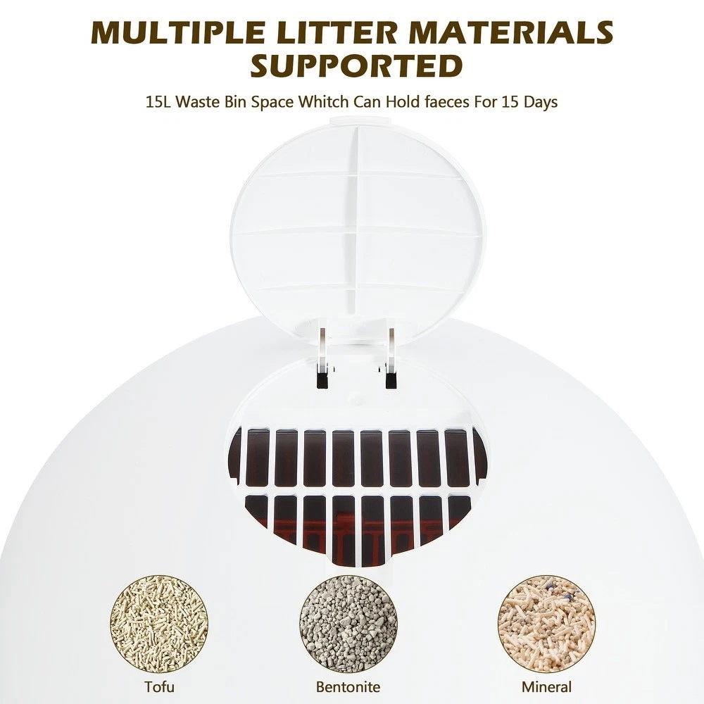 Details: Are you tired of scooping poop every single day? Worried about your cat's health while you're away? Well, worry no more! Our automated litter box is here to save the day. With the companion app, you can track your cat's weight, toilet habits, and monitor the litter box's status with ease. Say goodbye to the hassle of constant cleaning! With a spacious 60-liter capacity, it's perfect for cats of all sizes. Whether you have one furry friend or a whole bunch, our litter box provides a clean and comfortable space for them all. 【App Control & Monitoring】 Our app allows remote control and real-time monitoring of key functions such as power status, sleep mode, and refill reminders. Detailed usage records, including toilet times, duration, and cat weight, are conveniently stored for your reference. 【Advanced Sensor Technology】 Equipped with infrared sensors; our litter box ensures your cat's safety by pausing operation when your cat approaches. Additionally, a weight sensor accurately records your cat's weight and syncs the data to your phone. 【Spacious Design】 With a generous 60-liter capacity, our automatic litter box accommodates cats weighing up to 22 pounds, providing ample space for comfortable use. The 9-liter bottom bin can hold up to 15 days' worth of litter, reducing the need for frequent maintenance. 【Easy Maintenance】 Featuring a streamlined design, our litter box is effortless to disassemble and clean. The removable components facilitate quick cleaning, while the smooth structure ensures thorough sanitation. 【Versatile Compatibility】 Compatible with various litter materials such as tofu, bentonite, mineral, or mixed cat litter, our litter box offers flexibility to suit your preferences. Features Wi-Fi Connection Deodorizing and bacteriostatic Security protection APP intelligent remote control 60L large toilet space Health data record AI Learning Ultraviolet sterilization Specification Color: White/ Grey Overall: 20.5"L x 20.9"W x 27.2"H Door Size: 11.03L x 8.67H Volume: 60L Product Weight: 33LBS Specifications Assembled Dimensions Select an option to see dimensions Material Plastic Assembly Assembled Color White Size Extra Large Type Litter Box Enclosure Model Number Cat Furniture