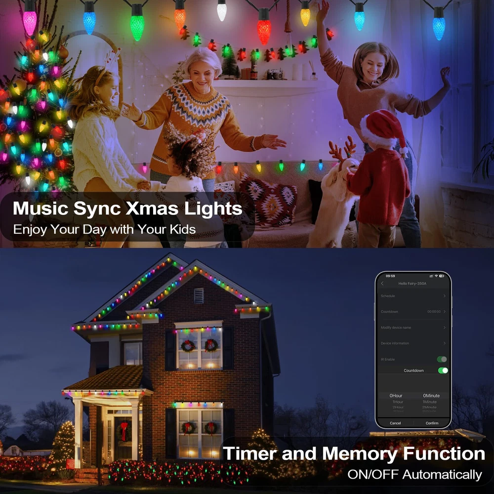 [DIY Smart C9 Christmas Lights] Compared with traditional Christmas lights, Our C9 Christmas decorations lights designed with IC chip , we can programmable the lights' color, dynamic and static modes, speed and brightness with our smart APP to make your favorite lights animation. Let your imagination run wild with customizable C9 color changing string lights to create the ultimate in decorative lighting. [APP or Remote Control ] Use our Smart APP to adjust the C9 outdoor string lights Speed , time, schedule, paused effect and 0%-100% dimmable color . You can Set brighter and fast flash Christmas decorations outdoor light to accent your Christmas party, Light up your Christmas decorations like never before with xmas lights outdoor. [Chasing and Synced Effects Ambiance Light ] DIY and preset scene modes provide various lighting effects, like multicolor or single-color flowing, jumping, sliding, twinkling, breathing, alternating, etc. When the C9 led christmas lights outdoor are played dynamically, you can press the pause button at any time to keep the lights in current state.Virtual grouping of multiple strawberry decor lights for amazing multi-object large outdoor decorations. [Timer and Memory Function] Customize your programmable Christmas lights' schedule for achieving home automation and because of the memory chip, it also can save the last lighting effect without re-setting . [Connectable and Waterproof ]Each set of C9 string lights for outside has male and female plug , You can connect them up to 60 meters (10M / each set ).The insulation material can protect the strand from cold winter, sun, wind, rain, snow and damp.
