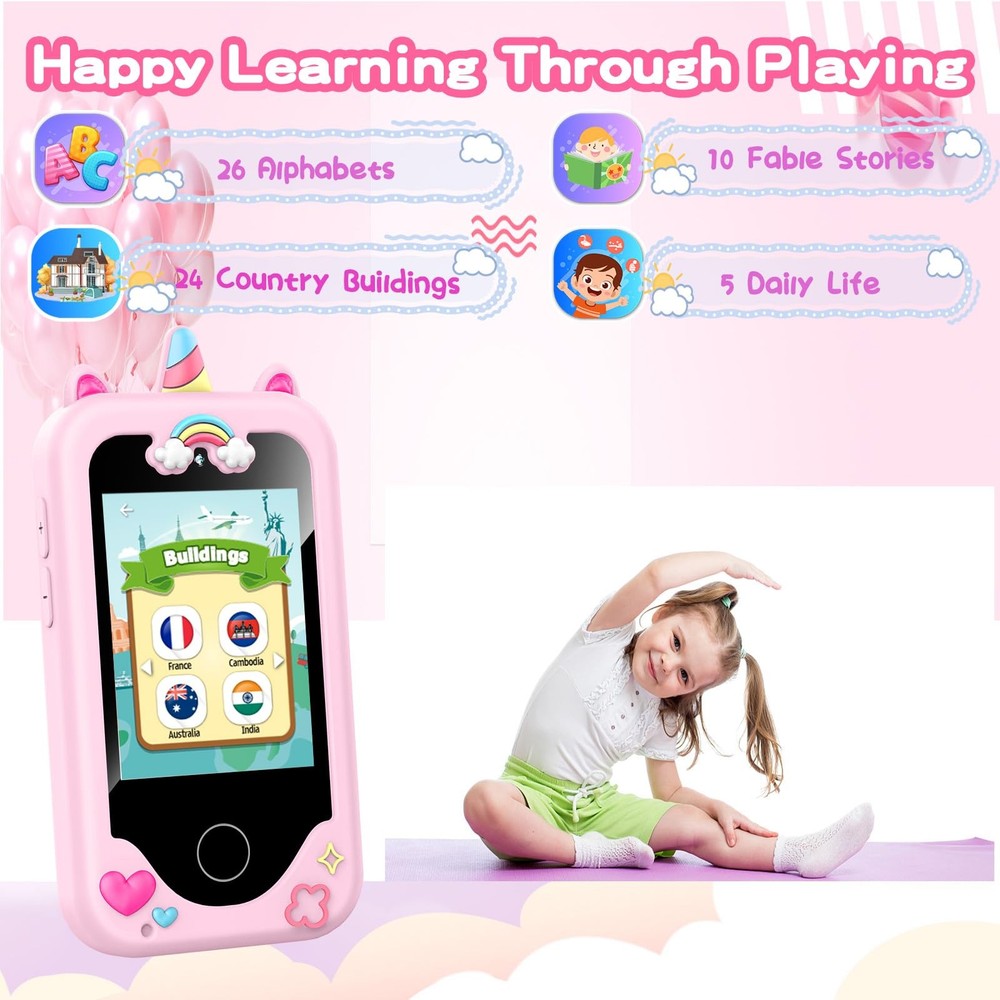 Kids Smart for Girls, Christmas Birthday Gifts for Girls Age 3-10,Kids Toys Cell , Toddler Learning Play Toy with Dual Camera, Game, Music Player Multifunctional Kids Smart :The upgraded touchscreen kids' cell comes with various features, including a selfie camera, MP3 player, games, paint, voice recorder, country and daily guide, alarm, flashlight, stopwatch, calculator, theme and screensaver selection, time format, volume control, and more. It offers convenience, fun, and a new experience for kids ages 4-12. Educational Kids Toy:The upgraded kids' toy features 26 alphabet lessons, 10 storybook fables, 24 country landmarks, 5 daily activities, and 13 puzzle games to enhance logic, thinking, and reaction skills. With the drawing feature, kids can express themselves artistically anytime, without needing paper or a dedicated drawing area. Habit Tracking: The toddler toy includes a built-in flashlight for exploring and a timer for managing time. The habit recorder helps remind children to engage in activities like studying, eating, and exercising, promoting the development of good habits and improving self-discipline and focus. MP3 Music Player and Funny Photo Frames: The kids pretend phones features high-quality speakers for enjoying music without headphones. It includes an SD memory card for downloading MP3 songs, pictures, and videos. Children can take photos with 23 funny frames, capturing happy moments with family and friends. Great Gift for Girls and Boys Ages 3-8:The kids smartphones is small, lightweight, and made from safe materials. It's an ideal gift for birthdays and Christmas for boys and girls aged 3 - 10.