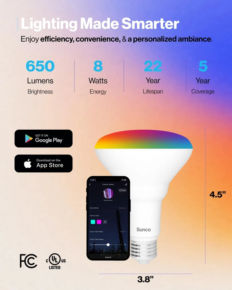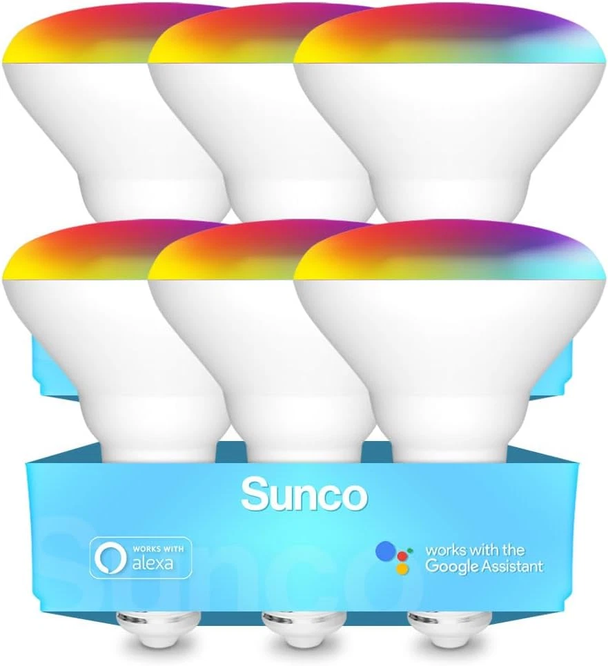 Top Rated BR30 LED WiFi (2.4 GHz) Smart Bulb, Color Changing (RGB & CCT), App (no hub required) & Voice Control ✅ REMOTE CONTROL - Enhance your smart home with Sunco's Smart BR30 Bulbs. Compatible with Amazon Alexa or Google Assistant for voice control to dim, turn on/off or change colors. Control bulbs individually or create different groups to control in unison. Great for 5” or 6" recessed cans. ✅ EASY TO USE APP - Control from your smartphone or tablet with the user-friendly Smart Life or TUYA apps. Note: Bluetooth, Location, and 2.4 GHz WiFi signal required for pairing. Not compatible with dimmer switches. Multiple bulbs must be paired one bulb at a time. ✅ CHANGE COLORS – Change colors via RGB rainbow color wheel or classic CCT (2700K-5000K) color temperatures. Bump up the beat and atmosphere with Music sync which changes color to the beat of your favorite song. ✅ SUNCO BENEFITS - 5-Year Warranty! Sunco is proudly based in the USA and upholds the highest standards for optimal performance and safety. Need help setting up your Smart bulbs or troubleshooting the Smart Life or TUYA app? Contact our knowledgeable specialists for further assistance. Not for sale in California. Product Description Music Sync Transform any setting into a pulsating dance floor, captivating concert, or relaxing retreat with light that moves with you. Intuitive Interface Control your lights anytime, anywhere using our convenient Sunco Smart Lighting app. Scheduled Timer Wake up to a gentle sunrise, get home to instant lighting, and create a cozy atmosphere before bed, all from your smartphone. Voice Control Ditch your switch & say ‘hello’ to handsfree lighting. Bright, dim, on, off — you control your lights without leaving the couch. Relax in Radiance Transform your space into a personal sanctuary. Embrace Productivity Create an environment optimized for work. Leveled Up Lighting Upgrade your gaming experience. 1 Relax in Radiance 2 Embrace Productivity 3 Leveled Up Lighting Similar Products Add to Cart Add to Cart Add to Cart Add to Cart Add to Cart Add to Cart Customer Reviews 4.1 out of 5 stars 1,408 4.5 out of 5 stars 136 4.5 out of 5 stars 1,110 4.5 out of 5 stars 1,100 4.5 out of 5 stars 758 4.5 out of 5 stars 672 Price $35.69 $ 35 . 69 $67.99 $ 67 . 99 $12.99 $ 12 . 99 $39.99 $ 39 . 99 $69.99 $ 69 . 99 $64.99 $ 64 . 99 Lumens 650 Lumens 850 Lumens 550 Lumens 1400 Lumens 965 Lumens 965 Lumens Wattage 8W 11W 7W 17W 13W 13W Equivalency 65W 65W 50W 100W 75W 75W Dimmable With App ✓ ✓ ✓ ✓ ✓ Moisture Rating Damp Rated Damp Rated Damp Rated Damp Rated Wet Rated Damp Rated Base Type E26 E26 E26 E26 E26 E26 Beam Angle (Degrees) 120° 110° 110° 110° 90° 90° Lifetime 25,000 hours 25,000 hours 25,000 hours 25,000 hours 50,000 hours 50,000 hours Smart Features ✓ - - - - -