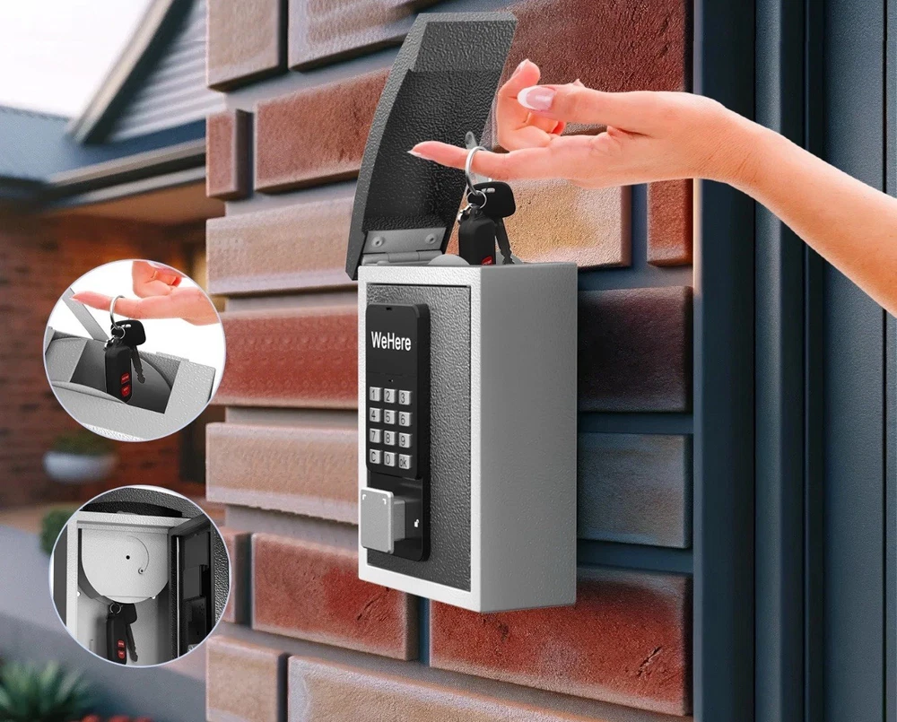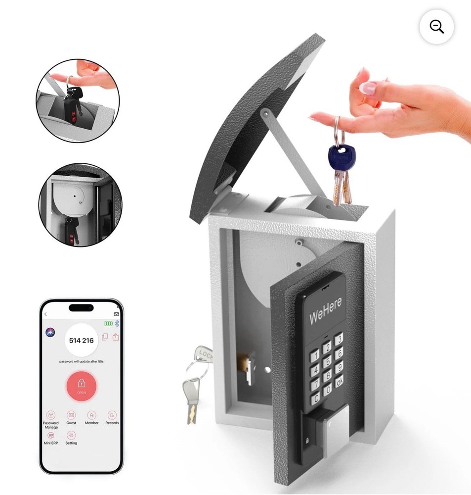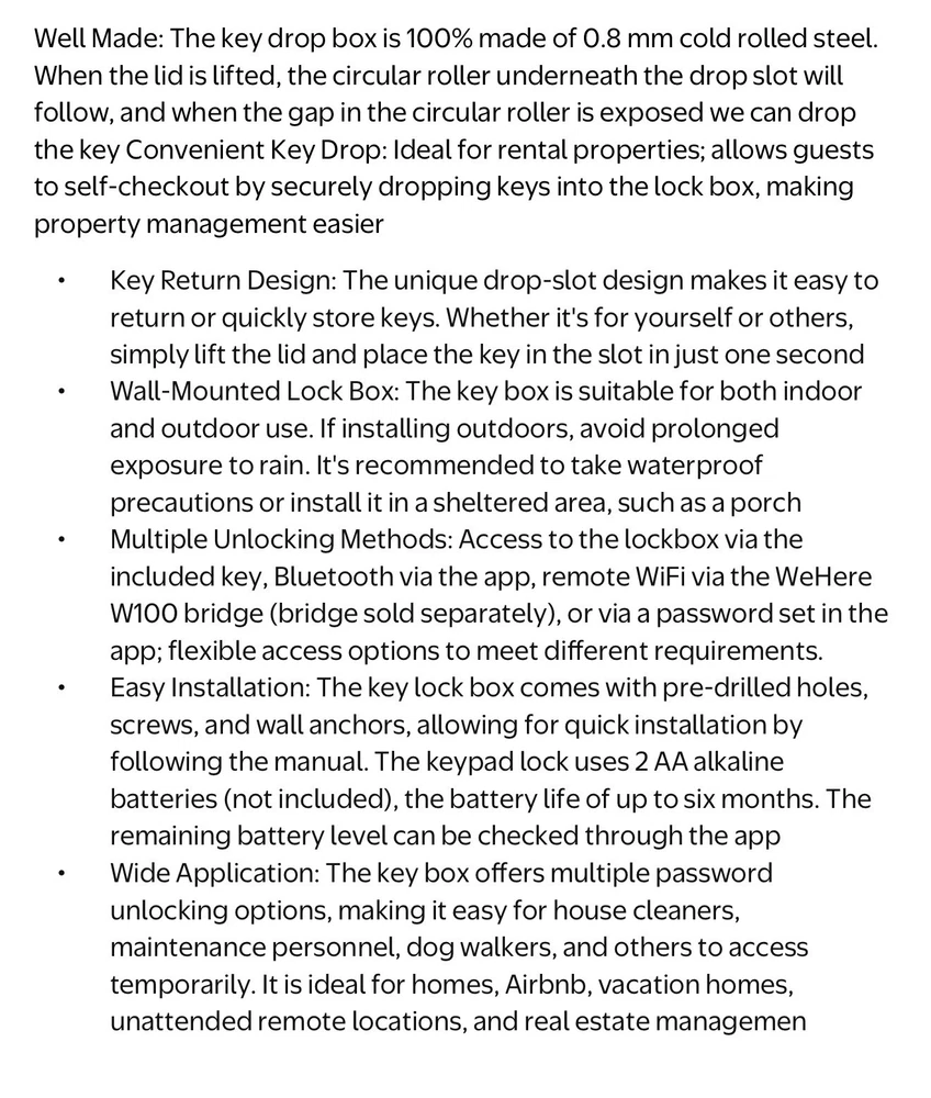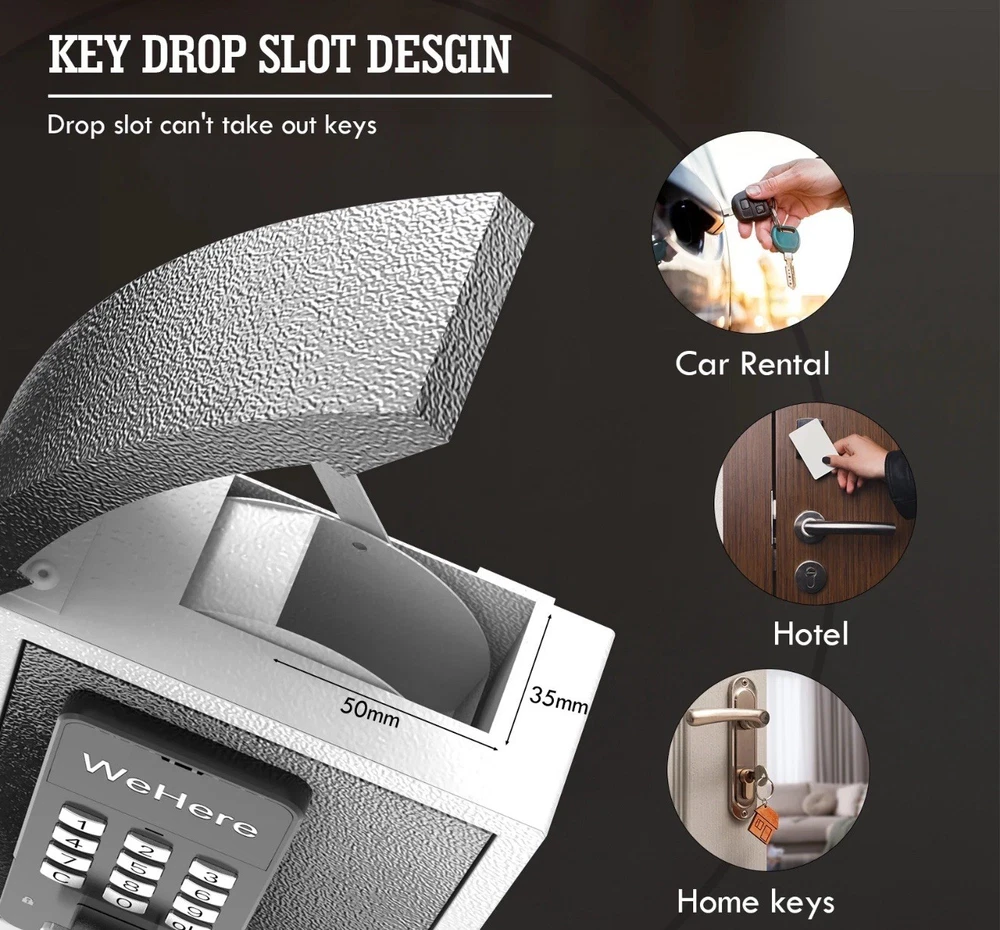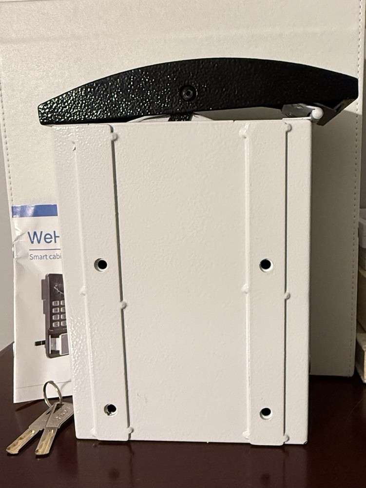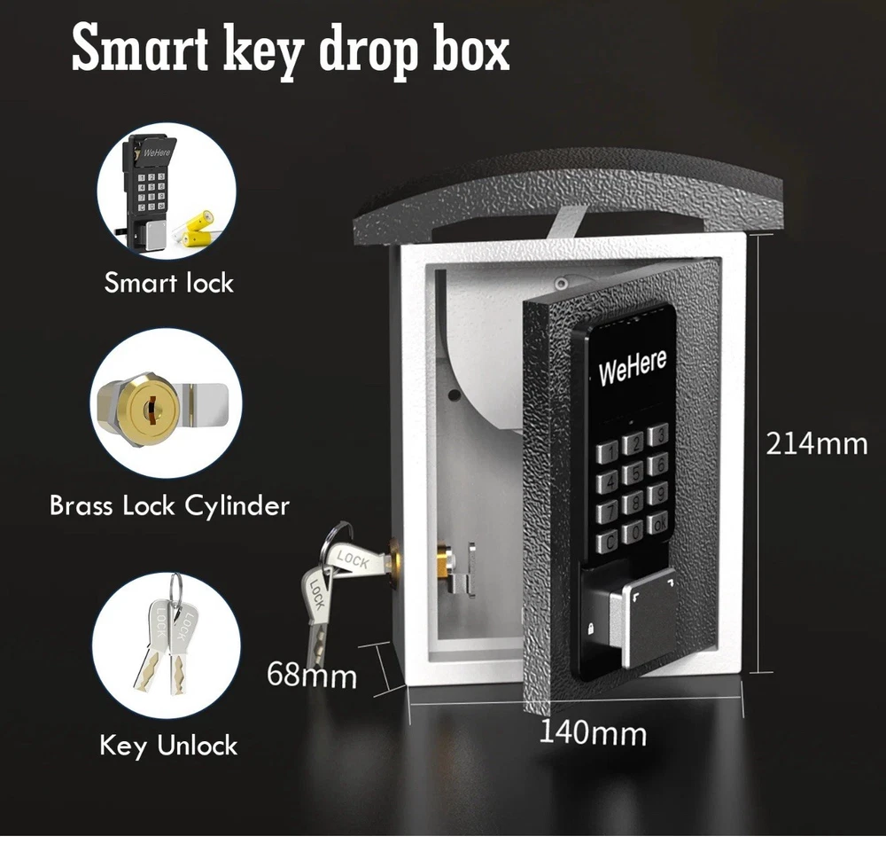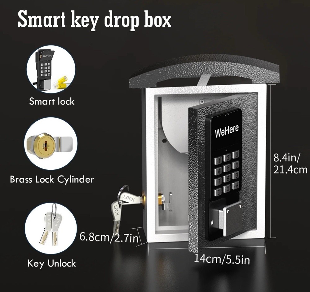 New open box. The lock box has a small scratch on the top of the drop lid as seen in the close up picture included. Made of steel and featuring electronic and mechanical lock types, this wall-mounted lock box is designed for key drop and storage. With a white and black color and dimensions of 26"D x 6.7"W x 8.4"H, it offers water-resistant capabilities. The free app access makes it an easy-to-use and reliable choice for businesses and homes looking to improve access control.