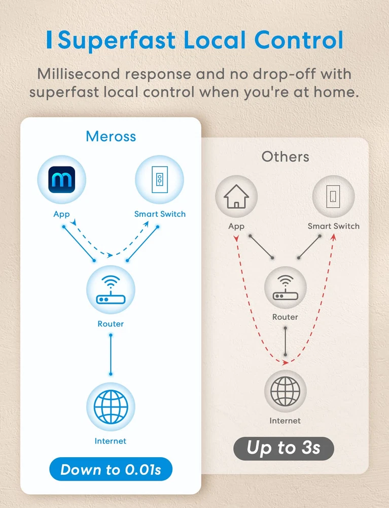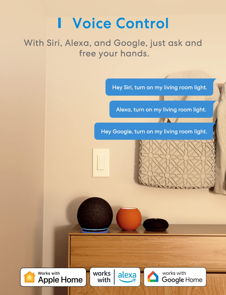 Neutral Wire Required: Please make sure your electric box has a neutral wire (in white color) before purchasing Smart Dimmer Switch. If you are not sure, please take a photo of the inner part of your electric box and send it to us. We can check it for you timely. Schedule and dim your light from 0% - 100%: Dim the light for the scenes you need. You can dim the WiFi dimmer switch via the Meross app, Apple HomeKit, Amazon Alexa, or Google Assistant with voice commands, or the wall switch hardware buttons. You can also easily schedule it to turn on/off or dim the light automatically. Sunrise and sunset settings are supported. Remote and Voice Control: Control your light from anywhere with internet access at any time with a smart dimmer switch. ONLY supports the Meross app. Compatible with Apple HomeKit, Apple Watch, Siri, Carplay, Amazon Alexa, Google Assistant, and SmartThings. You can give simple voice commands to turn on/off the devices that are connected to the Meross WiFi switch." Hey Siri, turn on the light". All data is securely transmitted and stored using AWS servers in the US. Easy installation: With Meross’s patent design, it only needs less than 15 min installation. Works in a single pole setup only (Not 3 Way). Meross smart switch fits for your existing 1/2/3/4 gang standard-size Decora/GFCI wallplate. The dimmer smart switch works with the 2.4G WiFi only, does NOT support 5G WiFi, and no hub is required. Note: Certified by FCC/ ETL. The Meross dimmer switch housing is made of PC+ABS fire-retardant material. Protection against electricity overload. Just a reminder that HomeKit remote control requires an additional networked Apple device at home such as a HomePod, or Apple TV. If you have any questions about your switch types, installation, or WiFi connections, please contact us, and we’ll help you sort things out. Product Description 1%-100% Range Dimmable Dim the brightness from 1%-100%. Manage and control your entire smart home lighting as you need. Hands-Free Voice Control Use simple voice commands to control your lights with Apple HomeKit, Alexa, or Google Assistant. Control From Anywhere Adjust the brightness or turn it on/off from anywhere with Internet access when you’re away. Apple HomeKit Supported Easily Integrate your devices into your Apple ecosystem to control them more conveniently. Customize Your Schedule Schedule connect the smart dimmer switch to turn on/off automatically, sunrise and sunset supported. Upgrade Dimming Experience The Meross app has a new compatibility test function to ensure that you will get the best experience 1 Voice Control 2 Remote Control 3 Works with Apple HomeKit 4 Timer & Schedule 5 Compatibility Test Millisecond Local Control Enjoy millisecond response and no drop-off with superfast local control when you're at home. Offline Control When the Internet is down, you can still control smart switch in Home Wi-Fi network via Meross app. Safety FCC/IC/ETL certified for safe use. 1 Millisecond Local Control 2 Offline Control 3 Safety Sunrise/Sunset Schedule your smart dimmer switch to turn on/off automatically at specified times or according to Sunrise/Sunset. No Hub Required The Meross single pole dimmer switch can be directly connected to your 2.4GHz Wi-Fi network without a separate smart home hub. Single Pole Light Switch This single pole dimmer switch is only used to replace a single pole switch rather than a 3 way switch. Customized Scenes Set up customized scenes to link your switch and other smart devices to match any occasion, such as saying good night to turn off all the devices. More Smart Devices from Meross Add to Cart Add to Cart Add to Cart Add to Cart Add to Cart Add to Cart Customer Reviews 4.3 out of 5 stars 10,959 4.1 out of 5 stars 217 4.3 out of 5 stars 185 4.2 out of 5 stars 291 4.2 out of 5 stars 782 4.4 out of 5 stars 1,720 4.0 out of 5 stars 737 Price $29.99 $ 29 . 99 $99.98 $ 99 . 98 $35.99 $ 35 . 99 $48.91 $ 48 . 91 $60.79 $ 60 . 79 $41.99 $ 41 . 99 — Works with Apple HomeKit ✔ ✔ ✔ ✔ ✔ ✔ ✔ Works with Amazon Alexa ✔ ✔ ✔ ✔ ✔ ✔ ✔ Works with Google Home ✔ ✔ ✔ ✔ ✔ ✔ ✔ Offline Control ✔ ✔ ✔ ✔ ✔ ✔ ✔ No Hub Required ✔ ✔ ✔ ✔ ✔ ✔ ✔ Neutral Wire / / Required / Required Required Required