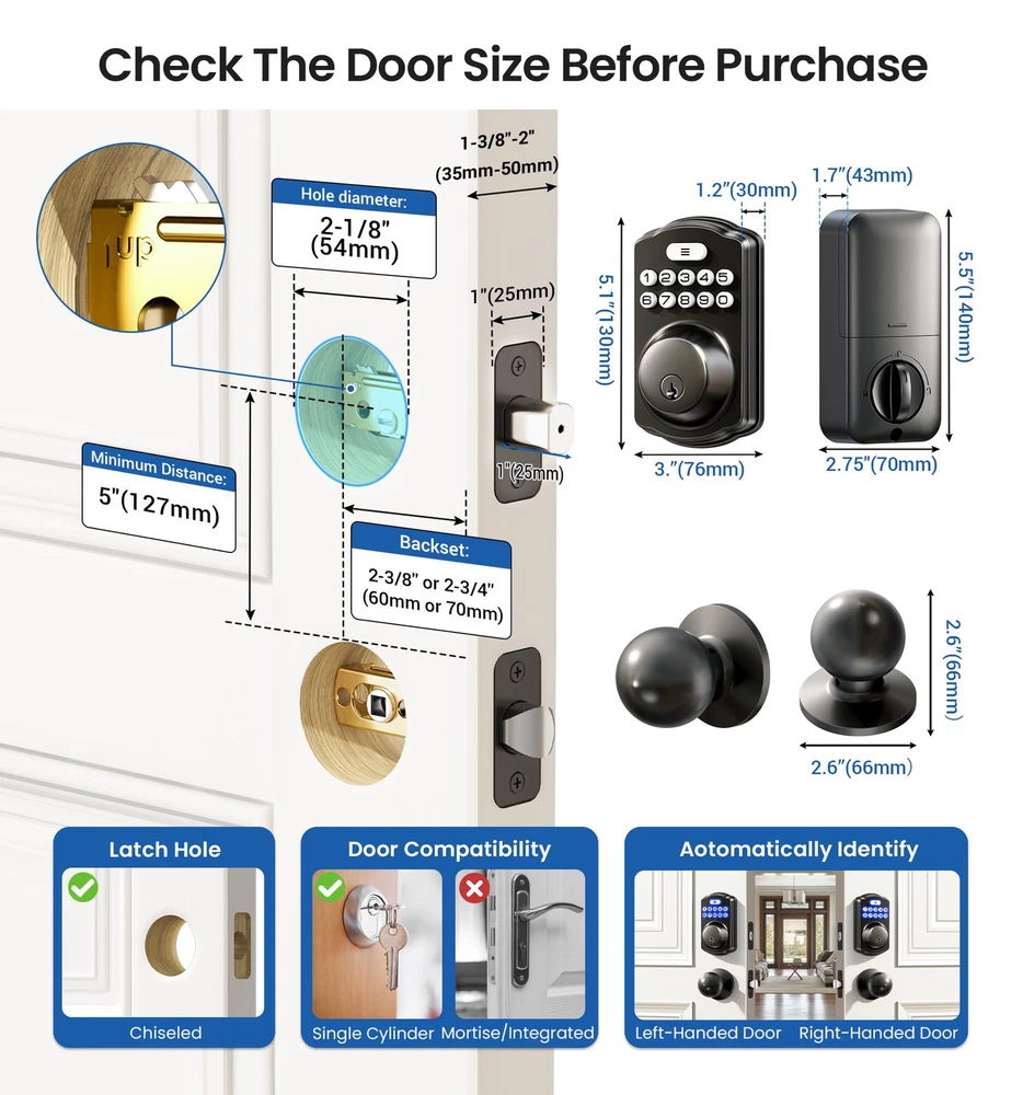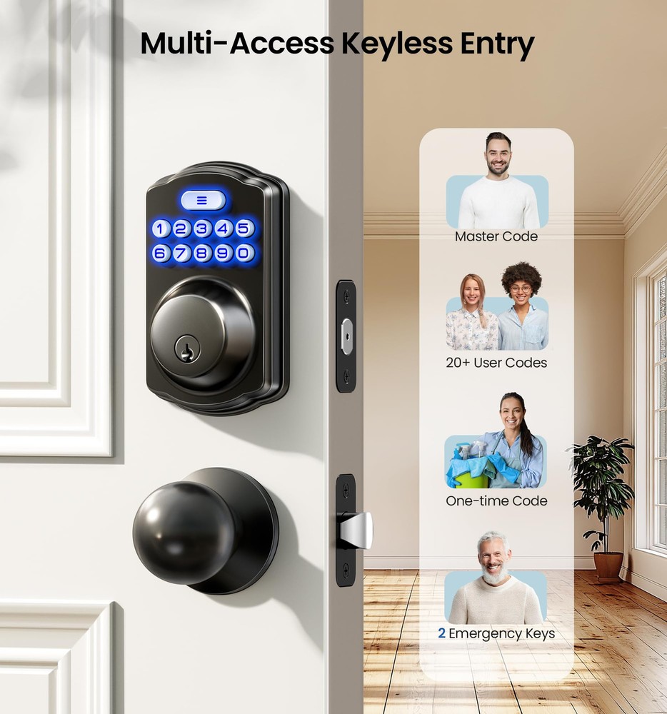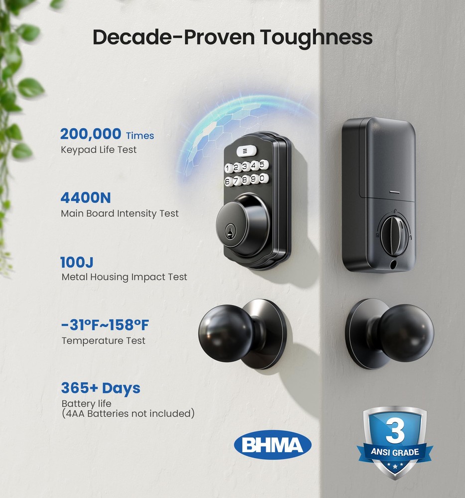 Keyless Entry: With 20 passcodes + 2 spare keys + one-time password for temporary visitors, the one-time code will automatically delete after use 3 in 1 Unlock: Codes, one-time codes, and keys can all be used to unlock Keypad Door Lock with Handle: A keypad deadbolt combined with 2 knobs, featuring anti-peeping codes, backlit keypad, low battery alerts, mute mode, and vacation mode Built to Last: The ANSI Grade 3 keypad door lock is made with a sturdy lock cylinder and alloy, powered by 4 AA batteries, and can last for more than 1 year Smart and Convenient: Set up the front door lock to 'auto lock' in 10-99 seconds, or press any key for 2 seconds to lock the door manually Easy to Install: With just a screwdriver, you can easily finish installation and programming in minutes. It is compatible with all American standard left and right-handed doors offers at least 1-year warranty and lifetime online phone support from Monday to Friday 9 AM to 5 PM PDT, and 24/7 after-sales email service