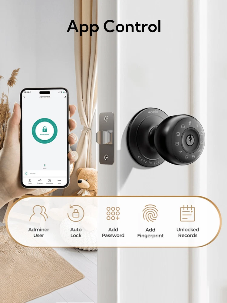 4-IN-1 Unlock Ways: Arpha fingerprint door lock provides 4 unlocking methods, including APP control, fingerprint unlocking, key unlocking, and spare key unlocking. The smart door knob with keypad support 50 fingerprints with 50 passwords, which is very convenient for multi-person households, and the fixed password can use 6-10 digits. App Control: You can set passwords, add fingerprints, temporary password, anti-peep passwords, auto-lock, etc. for this smart door lock on Tuya App. More functionality settings for you to explore! When the door lock is paired with the app, you can lock or unlock the door handle with just one tap. Biometric Fingerprint Unlock: This smart door lock with advanced fingerprint technology allows for 50 sets of codes, which is great for large families. And with a 99.99% recognition rate, this fingerprint door lock can recognise your fingerprint in just 0.3 seconds, allowing you to get in quickly. Smart & Convenient: Backed by advanced technology, this door lock is practical in more ways than one. This lock has an emergency Type-C charging port, you can use the portable power source to charge the lock if it runs out of power indoors. What's more, this smart door lock is adaptable to most weather conditions, whether it's -4°F or +140°F, it will work just fine, and this door lock has an IP54 waterproof rating.