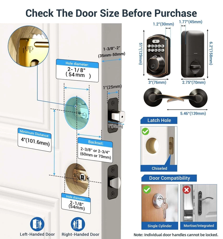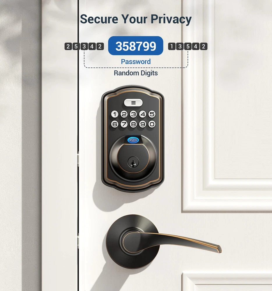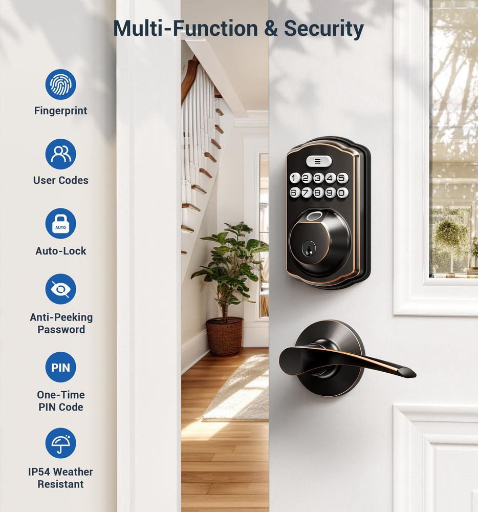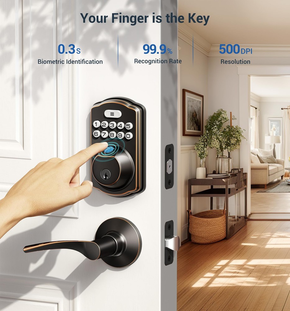 Fingerprint Door Lock recognizes your fingerprint within 0.3 second, and unlocks your door within 1 second. Multiple unlocking methods: Fingerprint + Passcode + Key. Make your life safer and more convenient. Includes all the necessary hardware components you need for an easy installation. Always forget to lock your door? Enable Auto Lock for peace of mind, or quickly lock your door on your way out by pressing and hold any single button for 2 seconds. Low battery indicator Last over 300 days with 4 AA batteries (not included); Get flashing red lights when batteries are getting low; Two backup keys are included as well, so you’ll always have access to your home. Support virtual password Enter digits before or after your access code to confuse prying eyes. Back-lit keypad makes the numbers readily visible in the dark with just one touch. Wrong entry limits Keypad is disabled after 10 incorrect access attempts, to ensure your property secured. Apply for all kinds of weather Built to work under low and high temperature (-31 °F to 150 °F). Advised to be installed under the roof, do not expose it to wet environment. Advanced Fingerprint Unlock: Identify your fingerprint within 0.3 seconds, and unlocks your door within 1 second with a 99.99% recognition rate [4 in 1] Unlock: Fingerprints+Passwords+One-time Codes+Keys to unlock your door lock Security and Durability: Keypad door lock with handles is ANSI Grade 3 Certified, IP54 weatherproof, withstands temperatures from -31 °F to 158 °F, and powered by four AA batteries for more than one year Auto-Lock & One-touch Lock: Set up front door lock set to "auto lock" in 10-99 seconds, or press and hold any key for 2 seconds to "One touch Lock" from outside; Rotatable knob- lock/unlock in 1 second from inside Easy to Install: Just with a screwdriver can easily finish installation and program by yourself in minutes, compatible with all American standard left and right-handed doors offers online phone support from Monday to Friday 9 AM to 5 PM PST, and 24/7 after-sales email service