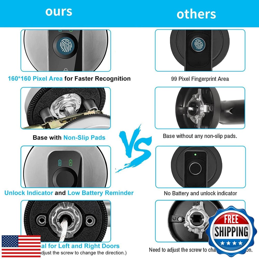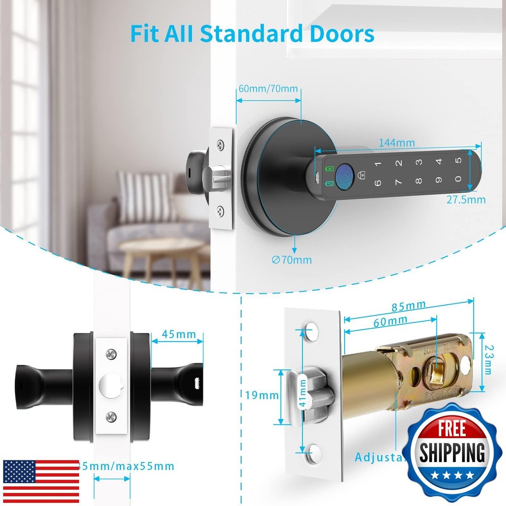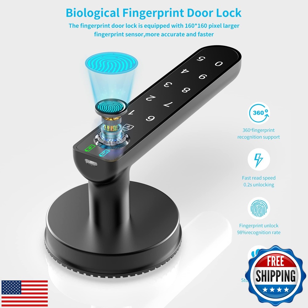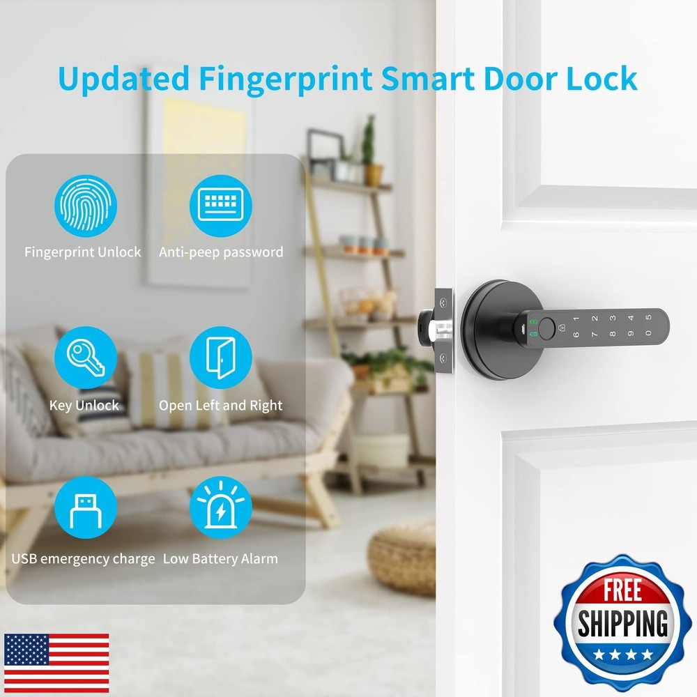 Fingerprint Door Lock with Keypads, Handle, Passwords, Fingerprint Door Knob Keyless Entry Door Lock for Home/Office/Bedroom/Apartment Black Features 【Amazing Fingerprint Reader】BAFUWEIY fingerprint door lock is equipped with a larger 160*160 fingerprint sensor with 35% more area than 120*120. 508 DPI fingerprint reader will be more sensitive when you use it, and the recognition is more accurate and stable; 【Three Ways To Unlock】Advanced 3-in-1 keyless entry door lock: fingerprint + anti-privacy virtual password + 2 physical key. 100 fingerprints and 50 sets of passwords can be added. A perfect smart door knob to get keyless entry door lock; 【Smarter, Safer and Stronger】BAFUWEIY fingerprint door knob is made of sturdy and durable zinc alloy. Support Virtual Code to Prevent Peeping. Auto Lock, Passage Mode, Silent Mode help you creat a smarter and more convenient life; 【Easy Installation】Biometric Door Lock is designed to fit US standard door,simple installation in minutes with a screwdriver (included). No wiring and no drilling. Door thickness: between1-3/8"(35mm) to2-3/16"(55mm), adjustable latch 2-3/8"(60mm) or 2-3/4"(70mm). Fit both left- right handed doors. Kindly check your door size before purchase; 【CUSTOMER SERVICE】 We not only provide detailed installation guides and clear user instructions, but also offer free technical support. If you have any questions, please let me know; Shipping Free & Fast Shipping: We offer free shipping to most of the USA with a normal delivery time of 3-7 days. However, due to the current situation, additional delivery time (up to 3 weeks) may be required for some items. Alternative Carriers: We may use alternative carriers (e.g., USPS, FedEx, UPS) to ensure your package arrives safely and on time. Due to the use of multiple carriers, we are unable to provide a tracking number automatically. Handling Time: Orders are processed and shipped within 1-2 business days of receiving cleared payment. Shipping Restrictions: Shipping to Alaska, Hawaii, Puerto Rico, Guam, and other US territories may incur shipping charges or delivery restrictions. Please contact us before ordering, or your order can be refunded/cancelled. State Restrictions: Certain items may not be shipped to California due to state regulations. Contact for Tracking Updates: If you require tracking updates or have any concerns about the delivery of your order, please feel free to contact us, and we will be happy to assist you. Return Policy 30-Day Hassle-Free Returns: If you are not completely satisfied with your purchase, you can return the item for free within 30 days of receiving it for a full refund or exchange. Easy Return Process: Contact us, and we will provide you with a prepaid return shipping label and detailed instructions. No Restocking Fee: There are no restocking fees for returns. However, the buyer is responsible for return shipping costs if the return is not due to a seller's error. Refund Processing: Refunds will be processed within 1 business day of receiving the returned item in its original condition. Payment We accept all major credit cards, PayPal, and Apple Pay for your convenience. Your payment information is secure and encrypted to ensure a safe and seamless transaction. Please complete your payment within 3 days of purchase to avoid any delays in shipping. Feedback Your feedback is extremely important to us. We strive to provide the best products and customer service possible. If you are satisfied with your purchase, please take a moment to leave us a positive review. If you have any concerns or issues with your order, please contact us before leaving negative feedback. We are committed to resolving any problems and ensuring your satisfaction. Contact Us If you have any questions or concerns, please feel free to reach out to our customer support team. You can contact us through the eBay messaging system. We are available Monday to Friday, 9:00 am to 5:00 pm EST, and we will do our best to respond to your inquiry within 24 hours. Thank you for supporting our small family business!