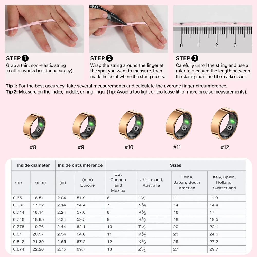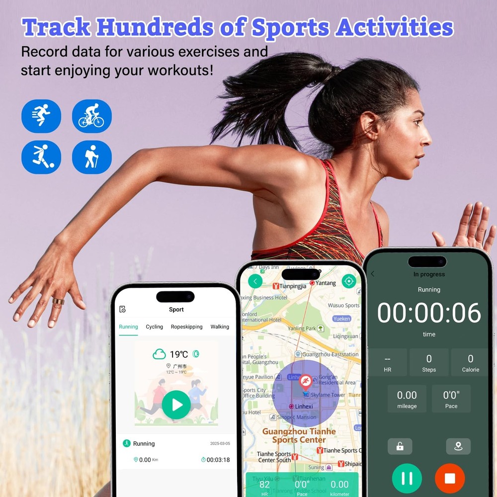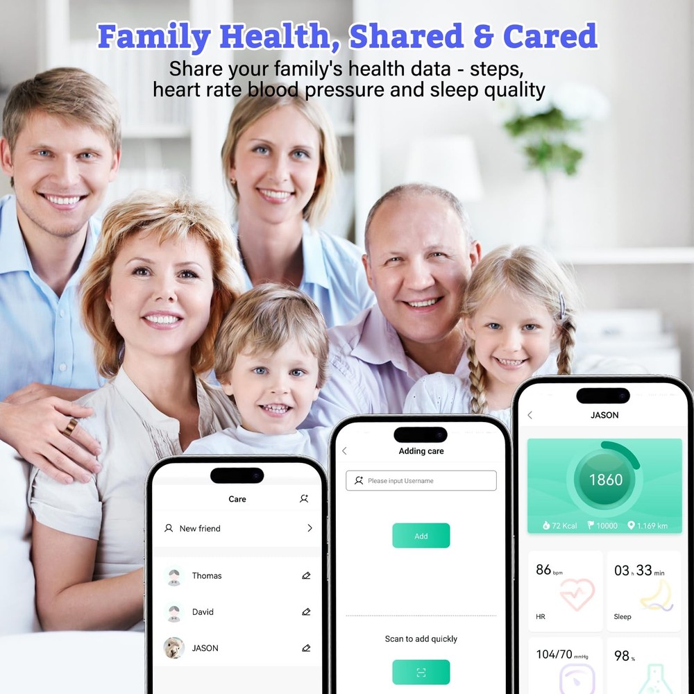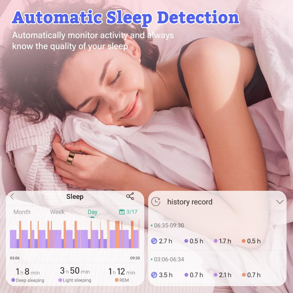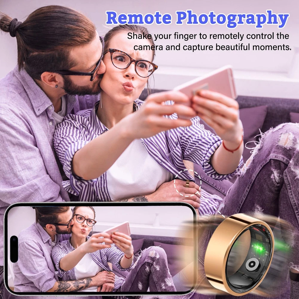 This sleek wearable seamlessly monitors key wellness metrics including steps, heart rate, blood oxygen levels, and nighttime sleep analysis (daytime naps excluded). Built for active lifestyles, it detects and records 15+ workout types like yoga, trail running, cycling, and jump rope sessions with real-time intensity feedback. All metrics wirelessly sync to your phone via Bluetooth 5.3, giving you instant access to your health stats wherever you go.Snap photos remotely with finger-tap controls—ideal for capturing group moments hands-free. Share activity milestones with family members through secure app connections, fostering friendly motivation while respecting data privacy. 【Your 24/7 Health & Fitness Partner】The Smart Ring for Men Women designed for all-day wear, this unisex ring monitors blood pressure, blood oxygen saturation, heart rate, and nighttime sleep patterns (daytime naps excluded). As a fitness-focused smart ring, it automatically records steps, distance, and energy expenditure. Nightly sleep analysis tracks your bedtime consistency, deep/light sleep phases, and restfulness scores—all synced to actionable daily reports. 【Shared Progress Tracking】The Fitness Tracker Ring Invite up to family members via the app to view their daily activity stats, heart rate trends, and sleep consistency. This multi-user health ring keeps your household motivated by celebrating milestones together while respecting individual privacy settings. 【Gesture Photography】The Health Tracker Ring With remote control photo function, Snap photos remotely by tapping your finger twice—no selfie sticks or timers needed. The camera-control smart ring maintains a stable Bluetooth connection within 33ft (10m), perfect for capturing group shots or spontaneous moments. 【Extended Power Solutions】The Vital Health Ring operates 3-5 days per charge (usage-dependent) with a rapid 45-minute full recharge. The included 300mAh charging case delivers 10+ emergency power boosts, ensuring your longevity-focused wellness ring stays active during hikes or business trips. 【Your Data, Your Control】The Sleep Tracker Ring Syncs seamlessly via Bluetooth with no subscriptions or premium tiers. The intuitive app organizes metrics from your self-owned health ring.All data is stored in daily, weekly, and monthly charts, allowing you to review it anytime. 【IP68 Durability】Shower, swim, or sweat without worry—this water-resistant activity ring withstands daily wear. Its durable finish resists everyday scuffs, maintaining a polished look through gym sessions, beach days, or office hours. 【Priority Customer Care】Our dedicated support team addresses most inquiries within 24 hours through email and in-app messaging. Whether optimizing your fitness ring settings or resolving syncing needs, we deliver clear guidance with minimal wait times.