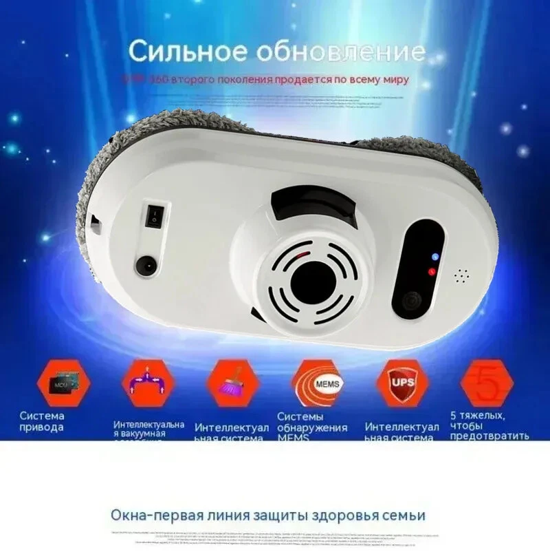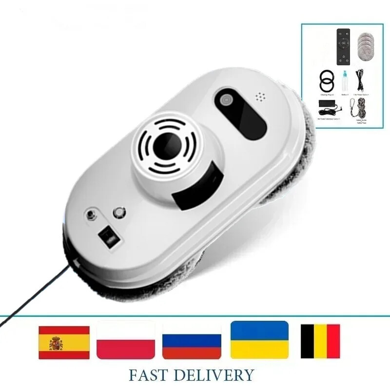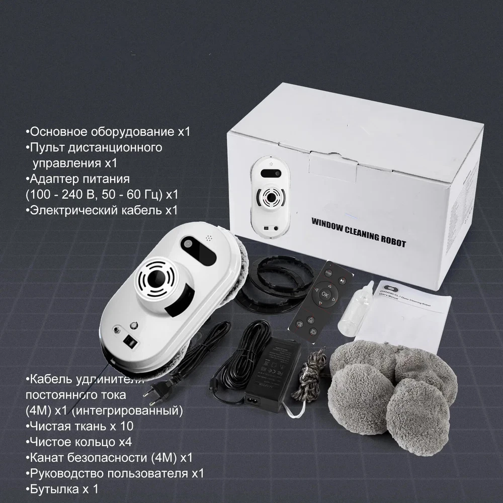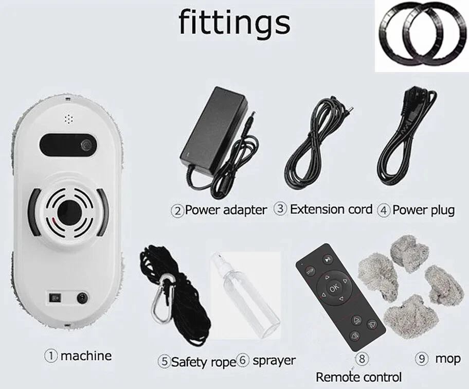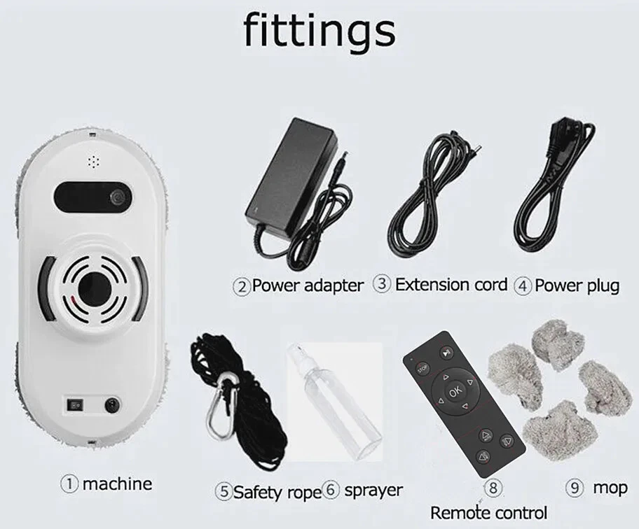 Packing list: 1 host 1 power cord + adapter, 1 remote control 1 extension of 4 meters 1 safety rope 6 cleaning cloths 1 manual (or English manual) 1 after-sales warranty card Using way: 1. Wait 20 seconds after starting up until the blue light stop flashing,Then start working. Because the robot need 20sec to detect the glass plane. 2. Binding the safety rope when using, Prevent falling from high altitude. 3. Spray some water on the edge of the Mop when working, will be better effect.