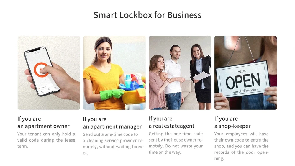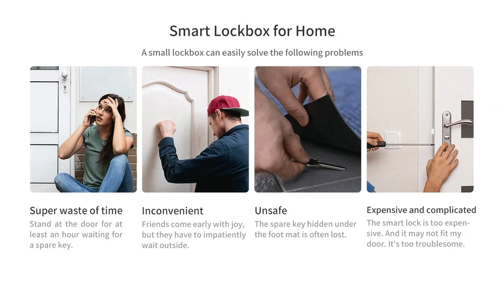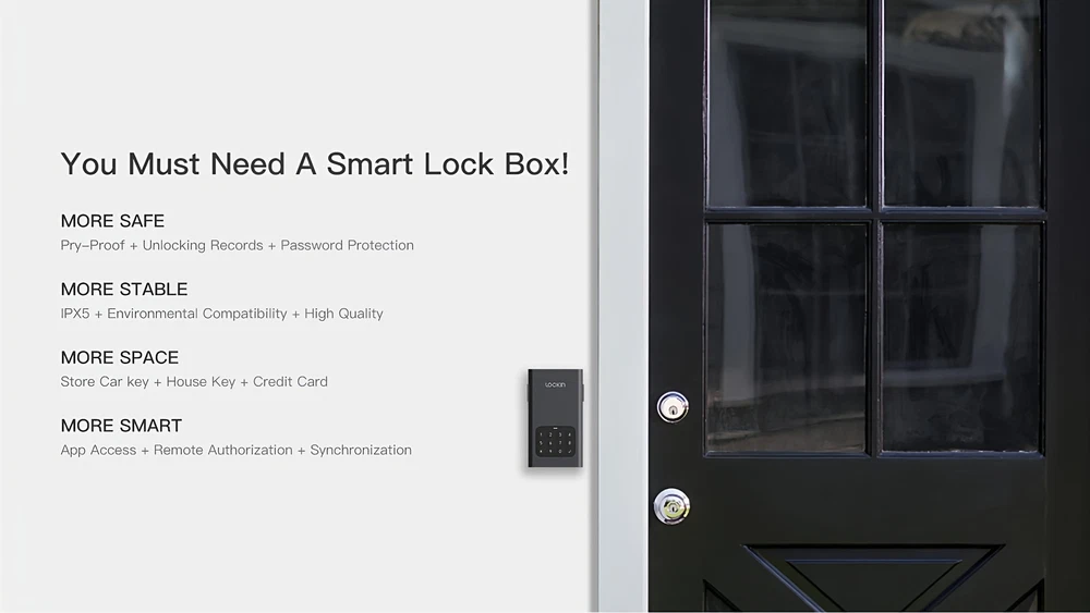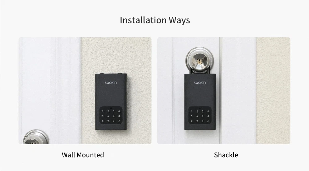 Specifcations: Product Model: Lockin Smart Lock Box L1 Unlock Ways: For Bluetooth,PIN Code Installation Ways: Wall mount /Shackle Body Material : Sheet Metal Shackle Material: Stainless Steel Password Length: 6 digits,support 16-digits Password Capacity: 30 Groups Bluetooth Distance: 1 Meter Net Weight: about 1KG Working Temperature: -20℃ - 50℃ Certifications: CE,FCC, ROHS Emergency Power: Type-c Battery: 2AA Batteries (not include) Standby Time: 12 Months Package List: Lock Box L1*1 Shackle *1 Screw Driver *1 Battery Cover *1 Quick Start Guide *1 Wall Anchor Screws *4 Battery Cover Screws *6