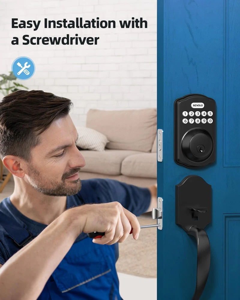 Features . 2 Access Methods: Keypad/key. -. Applies to Left-hand door and right-hand door. -. Add/Delete user’s code individually. -. Temporarily disable user code. -. One-time user code available. -. System will shut down for 45s if wrong user codes are entered over 5 times consecutive. -. Power efficient design and low battery alarm. -. Deadbolt Detection: Keypad deadbolt with auto latch bolt locking detection prevents any incomplete door locking, and the lock. Specification Power supply: 4 x AA Batteries Password: 4 to 10 digital Number of Users: 20 sets of user code, 1 set of master code Material: Stainless Steel Stamping (Exterior), Plastic (Interior) Latch: 2.34 or 2.76 inch, 60 or 70 mm Door Thickness: 1.37 to 1.77 inch, 35 to 45 mm Package Includes 1 x Electronic Keypad Deadbolts 1 x Handle set 1 x Instruction manual 1 x Door hole diagram Keyless Entry: This keypad deadbolt provides 20 access codes for family members and a temporary code for the one-time guests. This is the best solution for Airbnb, vacation rentals or family homes. Auto-Locking: The Anti-peeking password feature ensures your home security, Automatic lock or one-touch-locking effectively avoids the incomplete lock. This keypad door lock allows you to set automatically lock in 10-99 seconds or apply 1 touching motorized locking, so you never have to worry about leaving your door unlocked. Easy Installation - front door lock set comes with adjustable latch to fit most standard door preparations, including necessary hardware components. You can install it easily with just a head screwdriver. Stylish Design: This digital lock adds taste to your building with its unique shape lock and high-quality atmospheric handle combination. You won't need to buy an extra door handle. Built to Last: With a sturdy zinc alloy, Electronic Keypad Deadbolt was tested to handle the comings and goings of a busy household for over 30 years. Its IP65 rating makes it weather-resistant to keep your front door protected, no matter rain or shine. Customer Service: offers a 30-day customer commitment, along with a 1-year product support on all parts, lifetime phone support from Monday to Friday 9 AM to 5 PM PST, and 24/7 after-sales email service