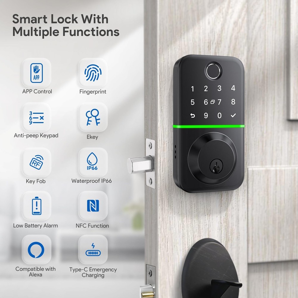 【Multiple unlocking ways】Offering various unlocking options: fingerprint, Bluetooth, App, password, FOB card, and physical key. No need to worry about forgetting to bring keys anymore. 【Convenient Auto Lock】The deadbolt lock will automatically lock after setting the auto-lock mode in the APP. You can also lock or unlock the door from the inside by rotating the knob in just 1 second. 【Control from Anywhere】If pairing the smart lock with G2 Gateway (The Gateway is sold separately), you can connect the lock with Wifi, then you can control the lock anywhere and any time. 【Easy Installation】You can finish the installation in around 5 minutes with just a screwdriver, without the need for additional drilling and wiring, as the lock is compatible with American standard doors. 【Security and Durability】The keyless entry door lock is built to withstand extreme temperatures (-22℉ to 158℉) and is IP66 waterproof.