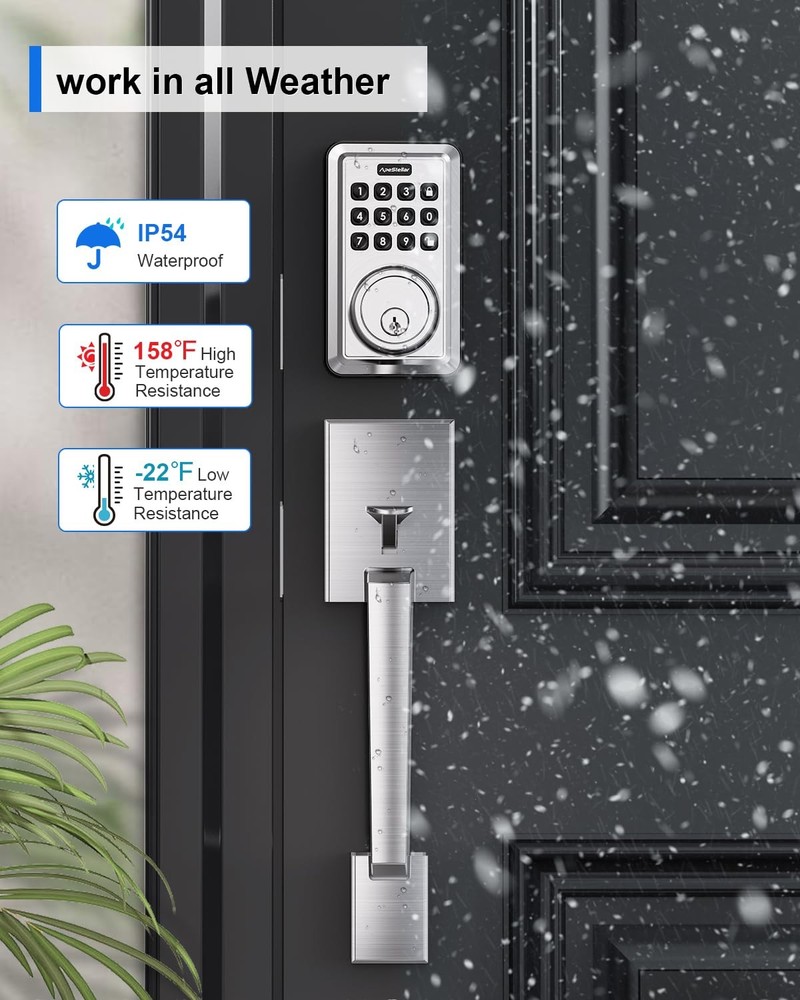 keyless door lock Keyless Entry Door Lock Deadbolt with Handle Set: smart door lock can create 50 passcodes for family daily use along with temporary one-time passcodes, for visitors, service personnel or other single-use entry. Security Front Door Lock Set: This electronic door lock with code is made of heavy zinc alloy instead of light weigh aluminum alloy, with strong motor, stable structure, sturdy cylinder, IP54 weather resistance, keypad deadbolt and handle with high-quality is certified ANSI Grade 3, for use on exterior door lock set where keyed entry and security is needed. Auto Lock & One Touch Lock: Featured anti-peep code protection and backlit keypad, our front door lock set with keypad can customizable automatic door locking after 5-900 seconds. Also a dedicated lock button can be one-touch lock. Friendly for elderly and kids. Keypad Door Lock with Handle: A deadbolt combined with front door handle and lever, featuring wrong code attempt limit, vacation mode, mute mode, low battery warning and excellent style design, perfect for your home or rental, traditional or modern decoration style. Easy Installation:keyless entry door lock deadbolt with handle set includes all necessary hardware, adjustable latch to fit 2-3/8" or 2-3/4" backset.You can replace your existing deadbolt handle set in about 15 minutes with just a screwdriver for just men and women. Compatible with all American standard left and right handed doors.