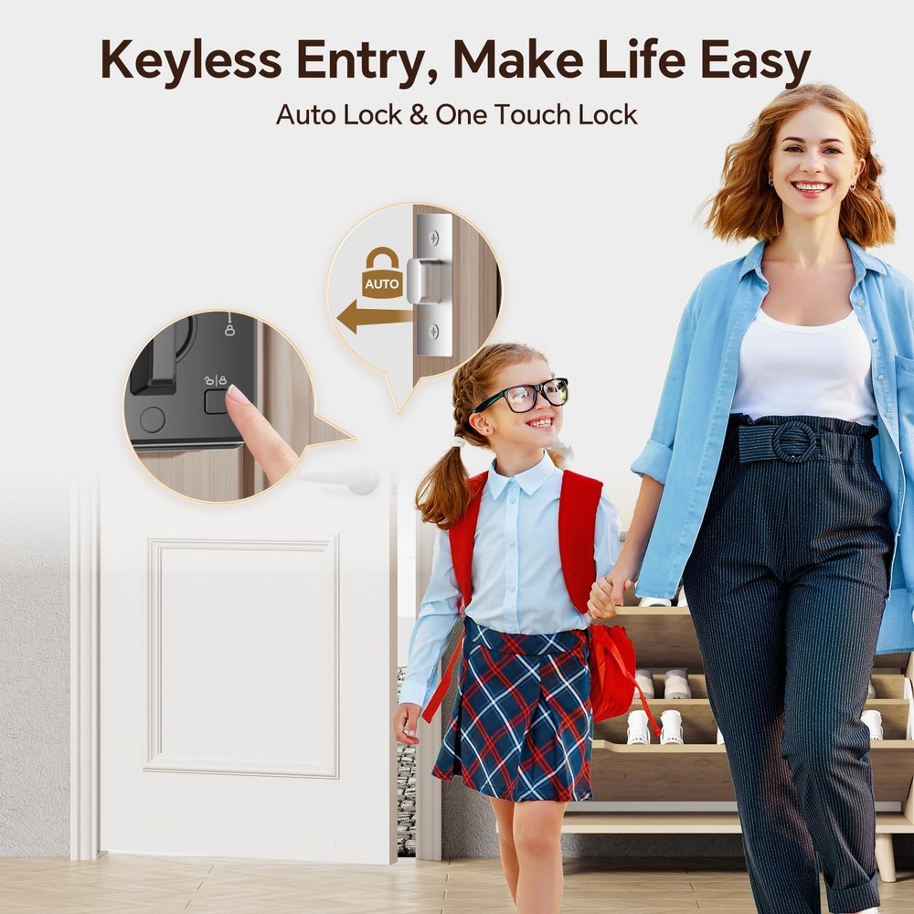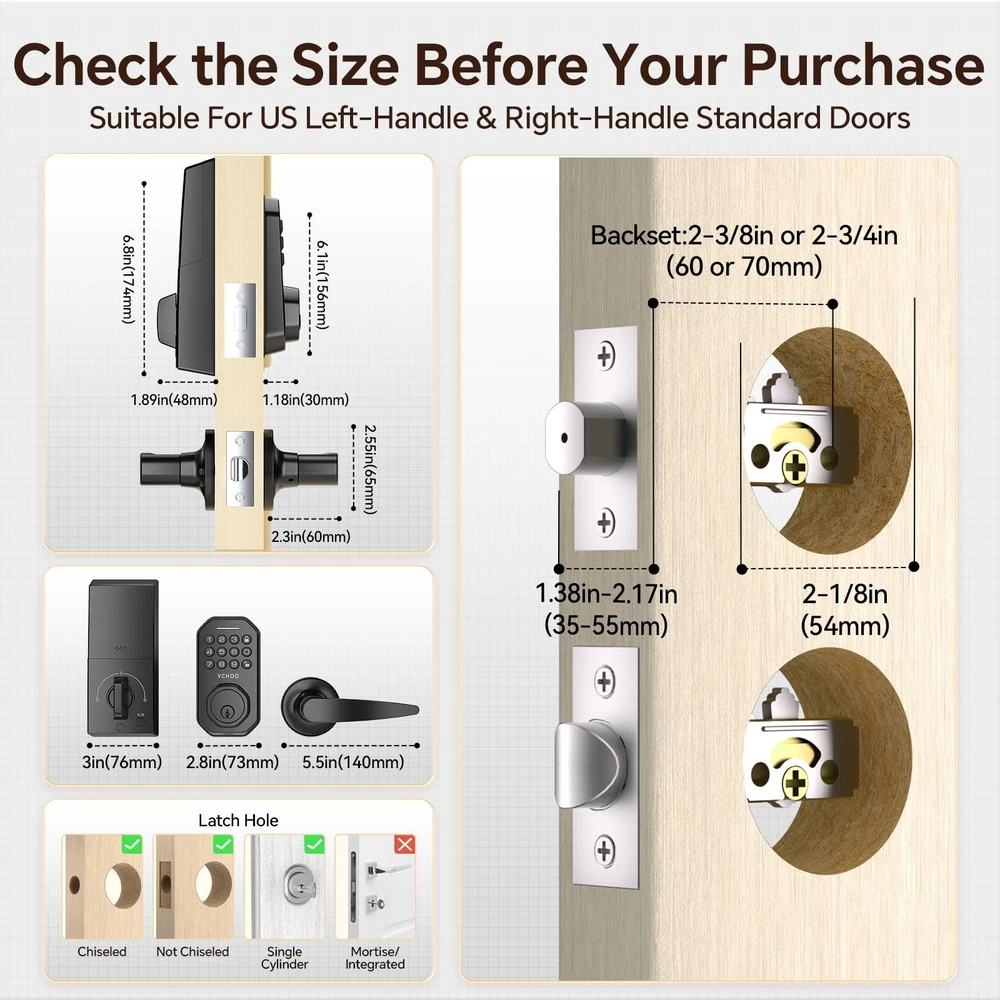 keyless entry door lock deadbolt with handle set keyless entry door lock with handle front door lock set keyless entry Multiple Ways To Access Keyless Entry Door Lock: keyless entry door lock deadbolt with handle set supports multiple ways to unlock, 100 user codes, one-time code, 2 physics keys. Door locks for front door was widely used in self-housing, hosts,offices,rental property management, school, hotels. Effortless Door Locks for Front Door: Smart keyless entry door lock has an automatic door lock function that can be set to auto-lock in 10-30 seconds and one-touch auto-lock by pressing, there's also a one-click button on the back of the lock, making life easier. Durable Front Door Lock Set, Secure Living Assistant: The smart locks for front door not only meets ANSI level 3 smart door lock core, lock body made of zinc alloy, IP54 waterproof (protect your home, rain or wind), but also specially set anti-snooping user password protection, all-round protection of your security. Convenience Door Locks: We have designed low battery alert function, once the smart door lock appears green light, please replace the low 4 AA batteries in time, in special cases, you can borrow the emergency TYPE-C charging port of the door lock to unlock. (Notice: 4 AA batteries are not included in the package). Easy to Install: The keypad door lock with handle has 2 matching Lever handles. No locksmith is needed. Replace existing locks in minutes with a screwdriver, compatible with left and right-hand doors. (Door thickness range 1.31 "-2.16"). door locks equally at home in both time-honored and cutting-edge residential designs. Profession Sales Team: is committed to providing quality products and customer service. We strictly check and control every link of the product. If you have any questions about our front door lock, please get in touch with us, we are at your service.