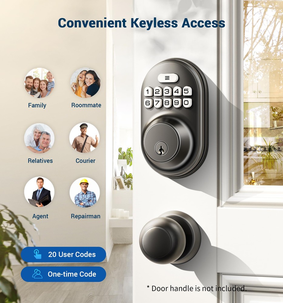 This keyless entry door lock is a game-changer for convenience and security! The smart keypad allows 20 permanent codes plus temporary guest access that auto-deletes after use—perfect for visitors. I love the anti-peeping feature and auto-lock function (set between 10-99 seconds) for peace of mind. The sturdy ANSI Grade 3 deadbolt feels premium, and the backlit keypad makes nighttime entry easy. With 4 AA batteries lasting over a year plus backup keys, it’s reliable and hassle-free. Installation was straightforward, and the modern design elevates my home’s entrance. Highly recommend for anyone wanting a seamless upgrade from traditional locks!